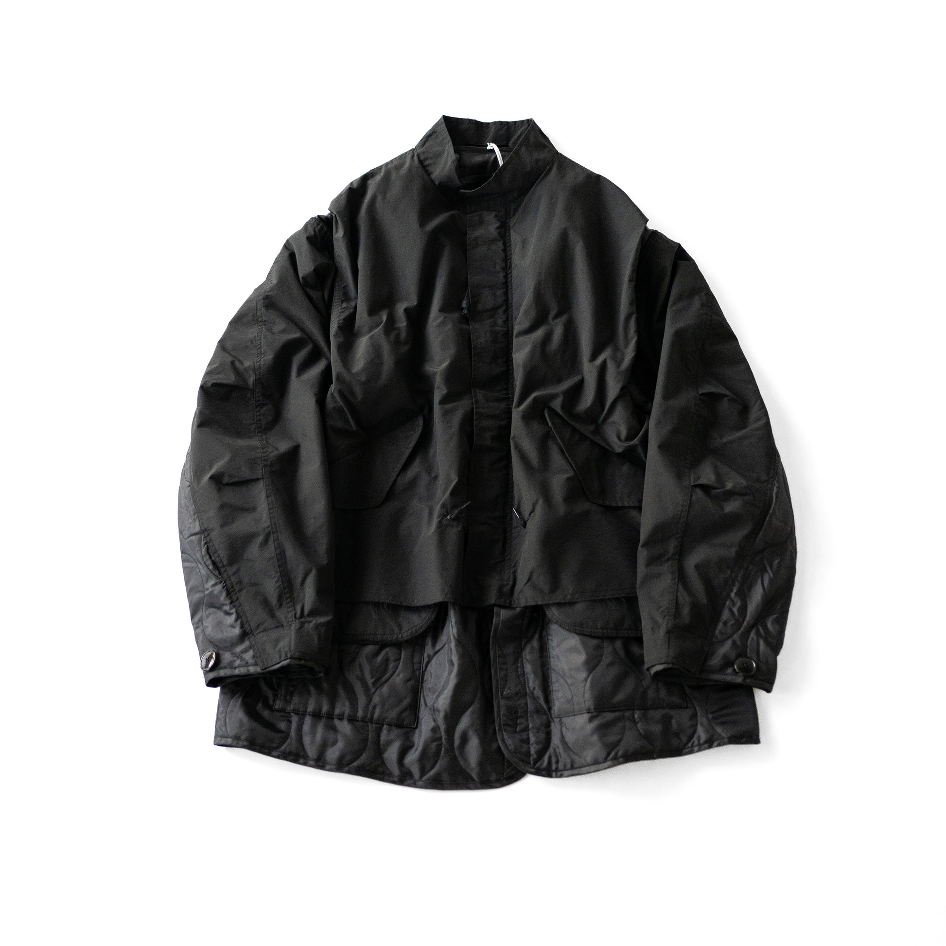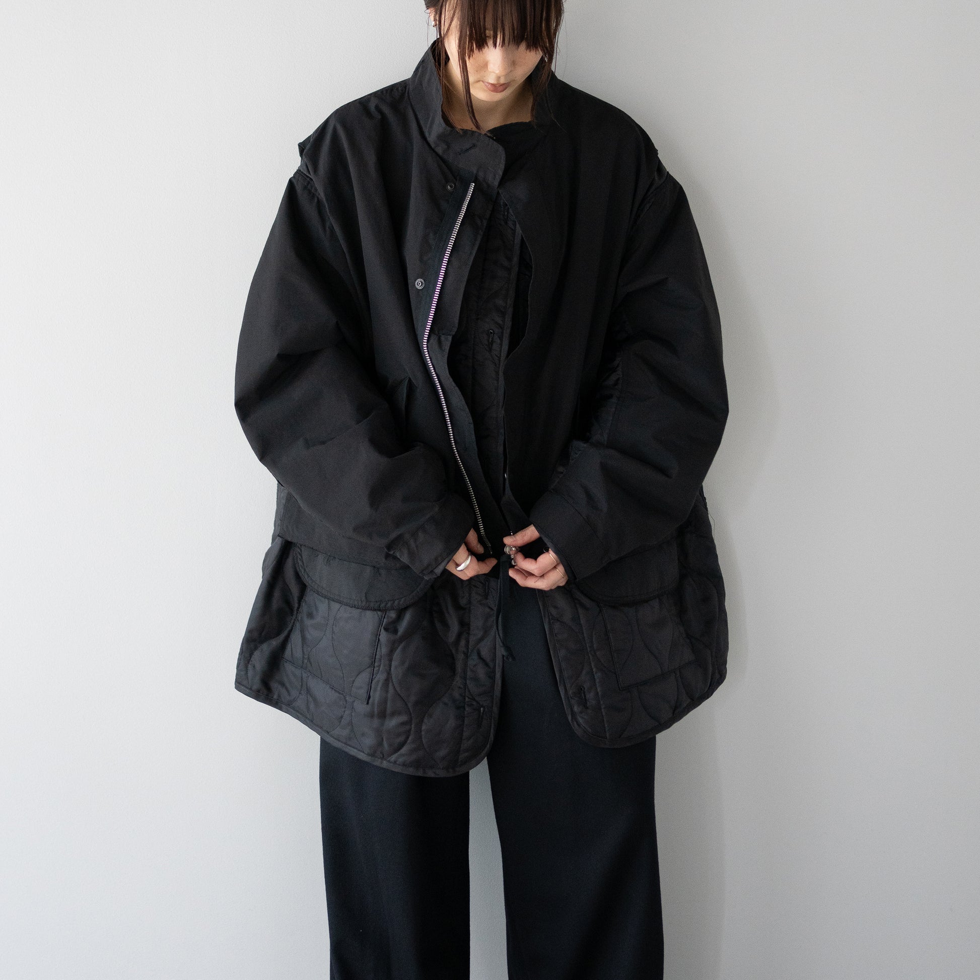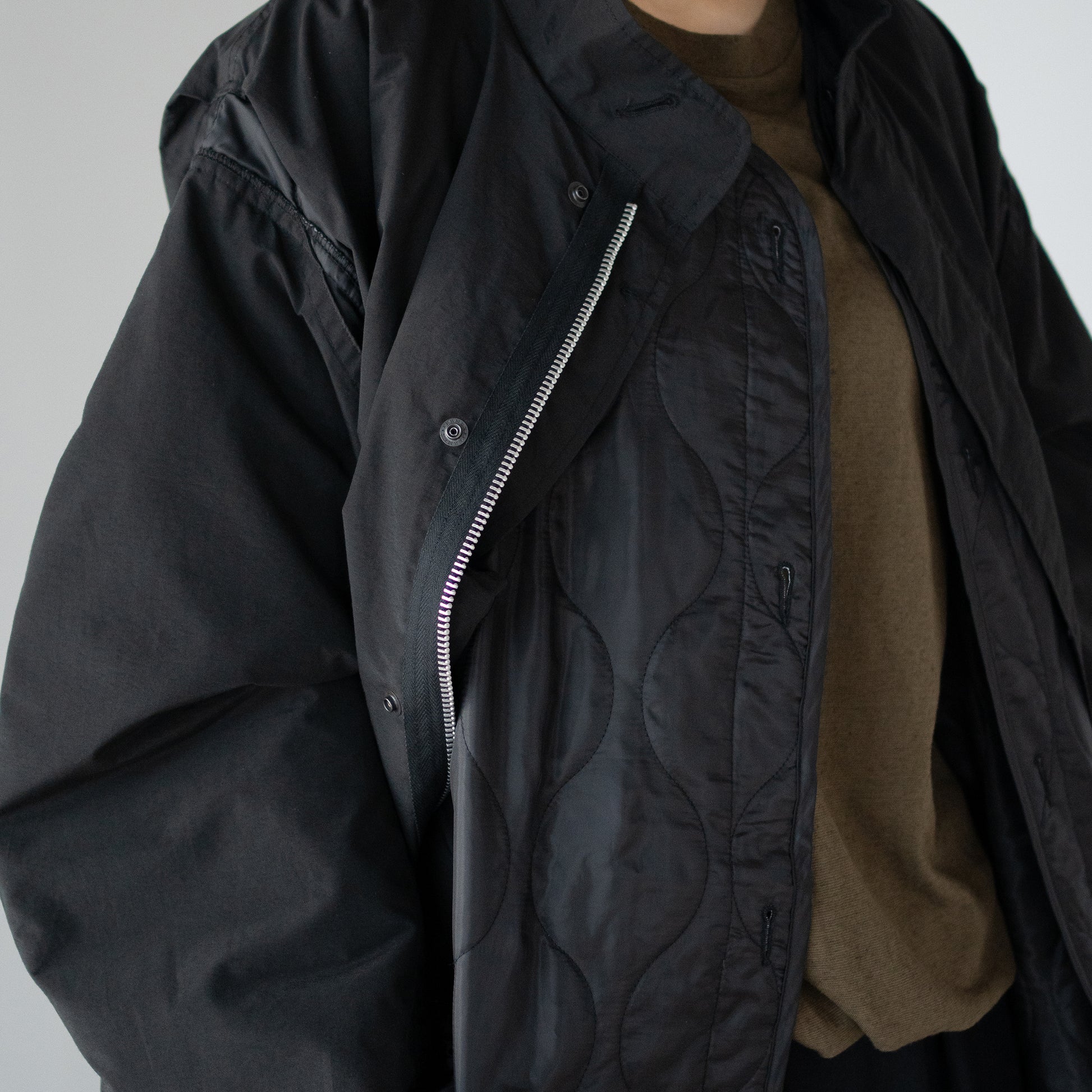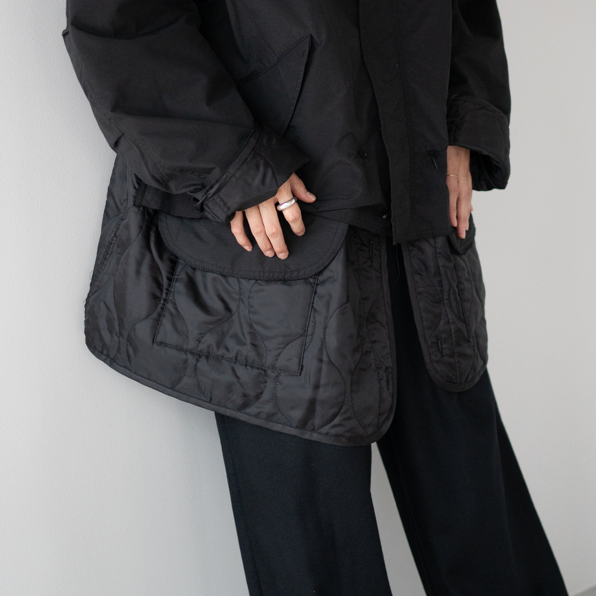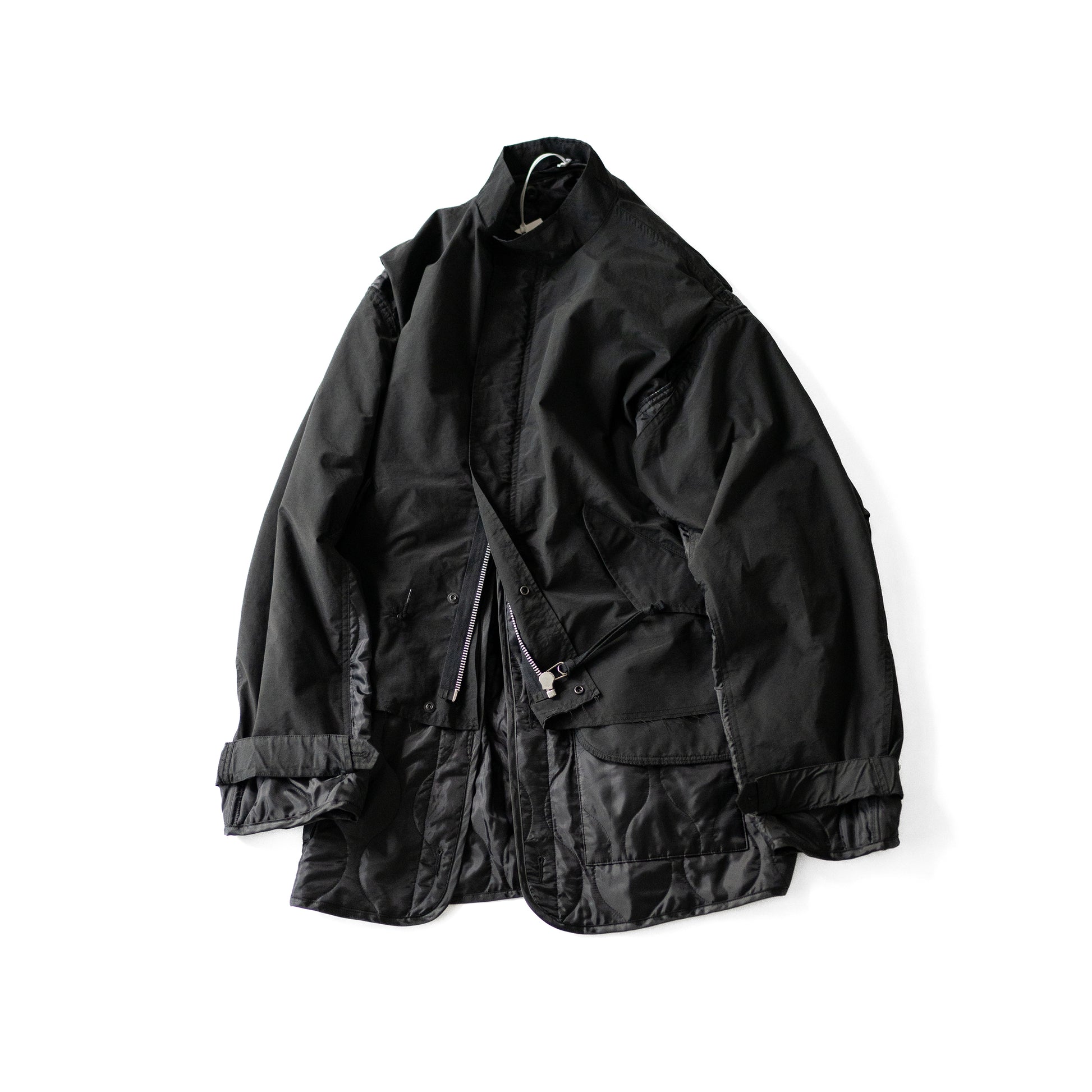 M-65 Fishtail Parkaとキルティングライナーが再構築されたミリタリーブルゾン。 コートの着丈をブルゾン丈にカットし、下からキルティングライナーがのぞくような仕様に。キルティングライナー側のポケットも使用可能。袖も解体し、ライナーと縫い合わせることで違和感のある生地のあまりが生まれます。マン・レイのシュールレアリスムのオブジェのインスピレーションから異なるアイテムの組み合せを構築したデザイン。