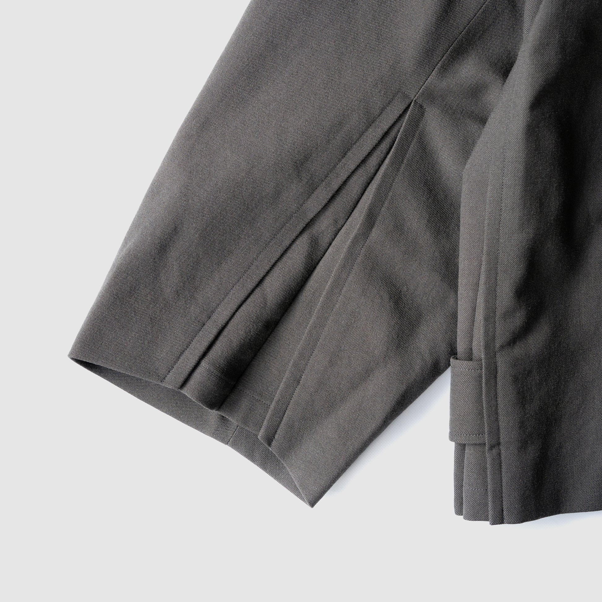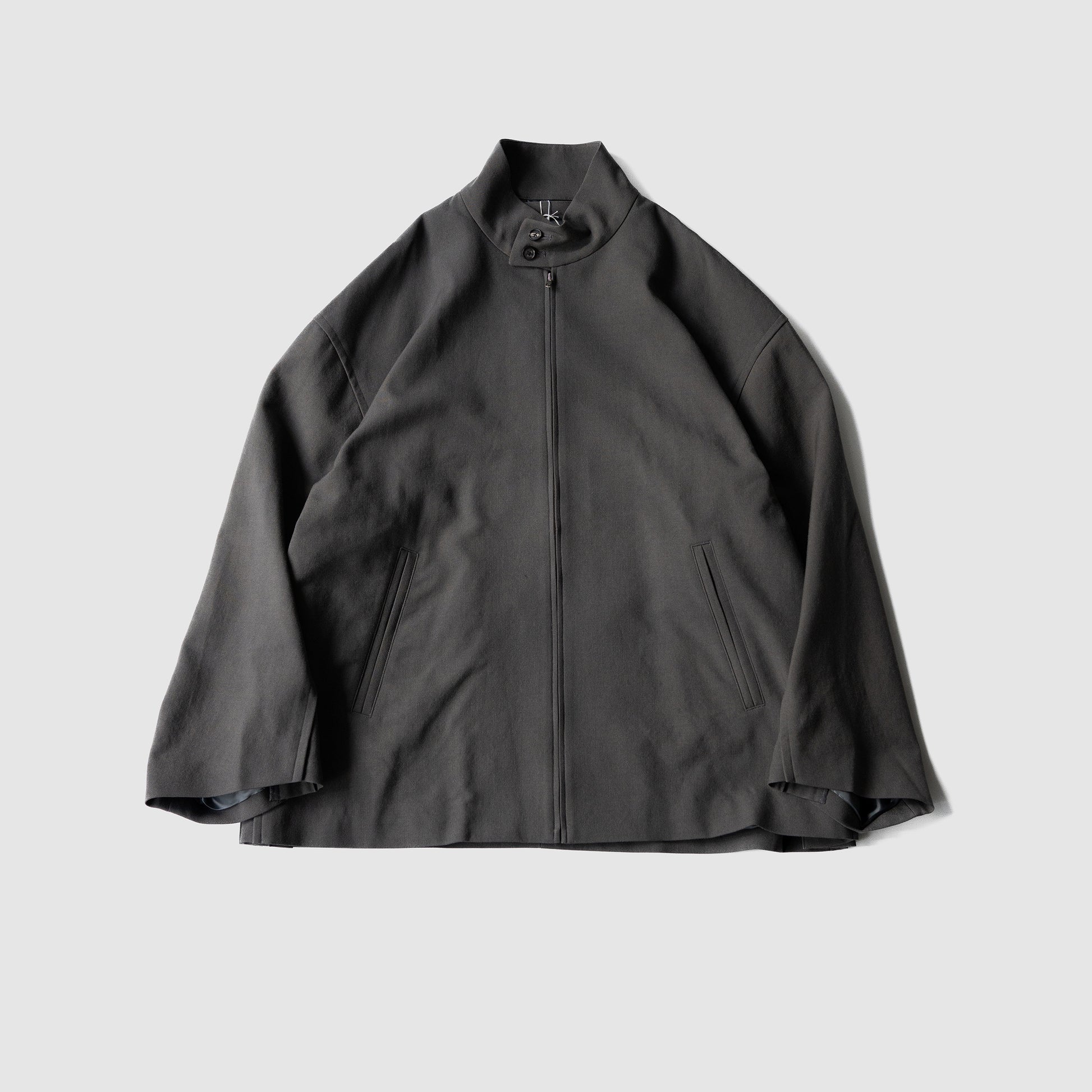 オーバーサイズのハリントンJKT。ドリズラー、スウィングトップなど様々 な呼び名のあるショートブルゾンの定番。袖、裾リブやヨークなどを排除し、 一見シンプルな表情ですが、サイドにはインバーテッドプリーツの様な仕様 を加え、タブの付け外しでシルエットを変更でき、袖口はプリーツによりややAライン的に広がるディテール。ネックに沿うスタンド襟に本水牛ボタンが付属。