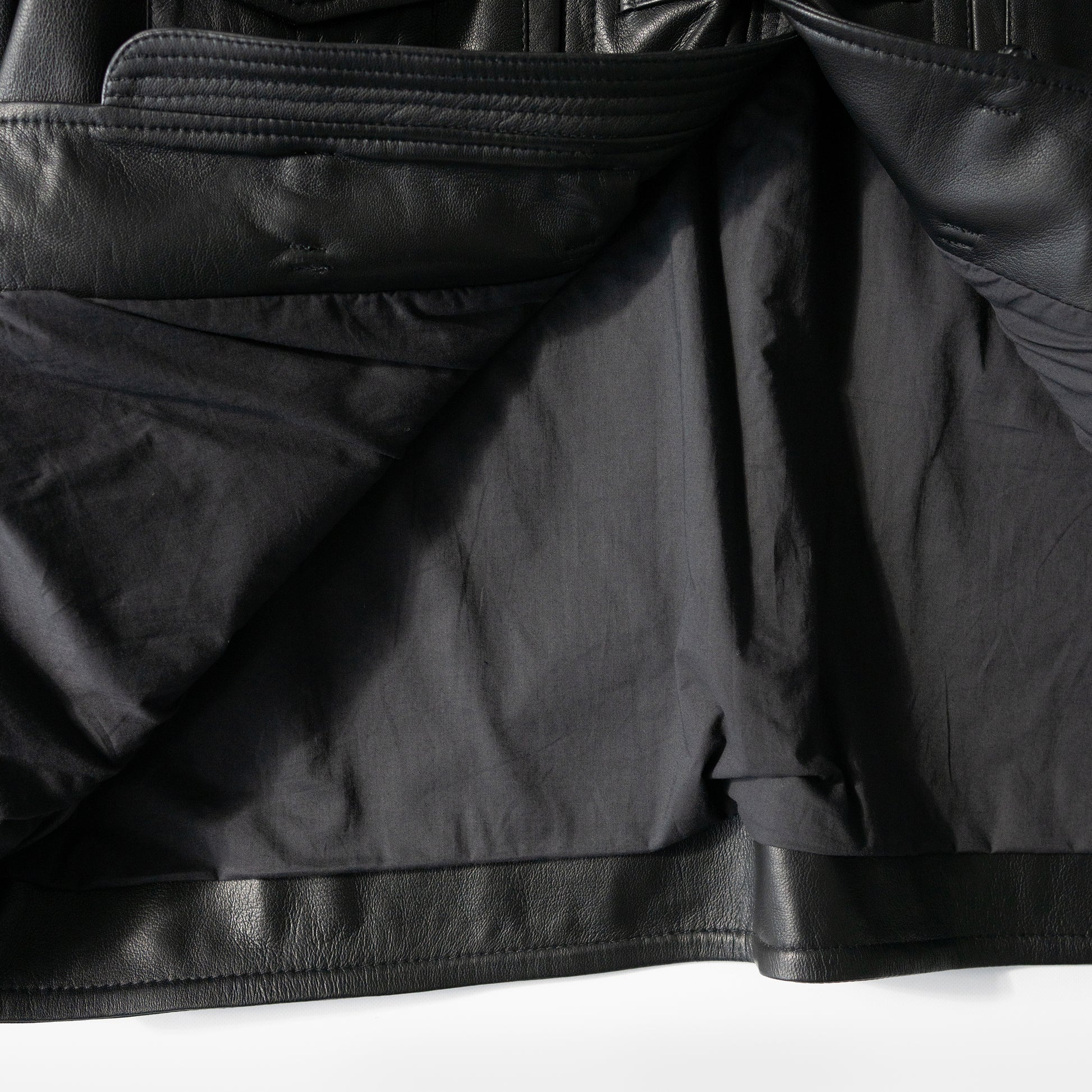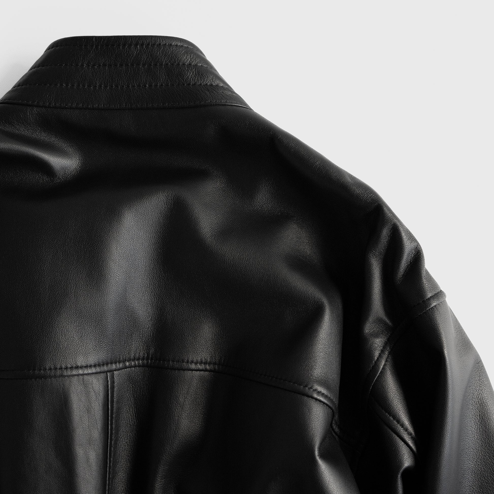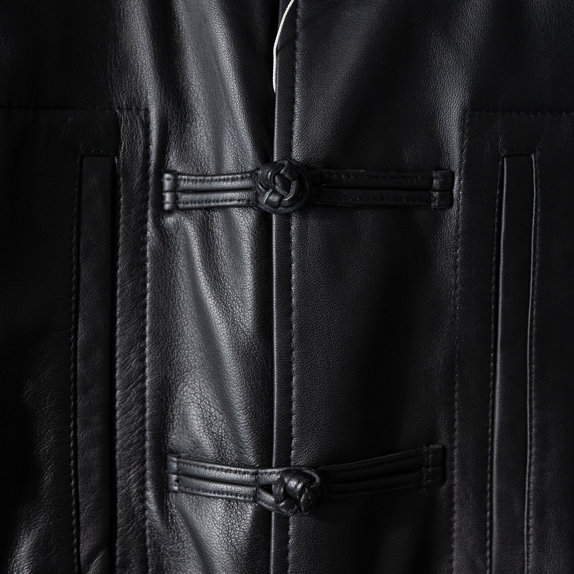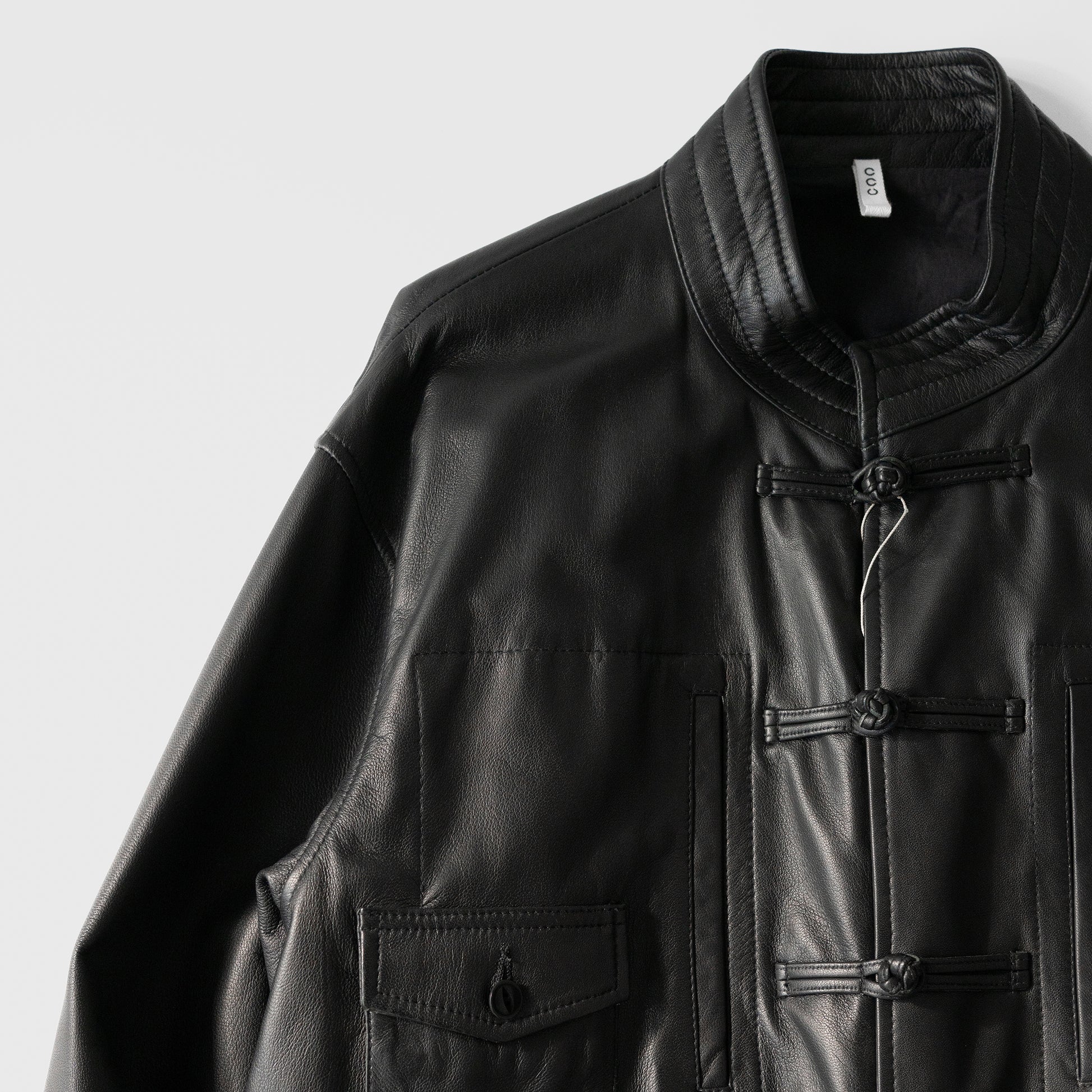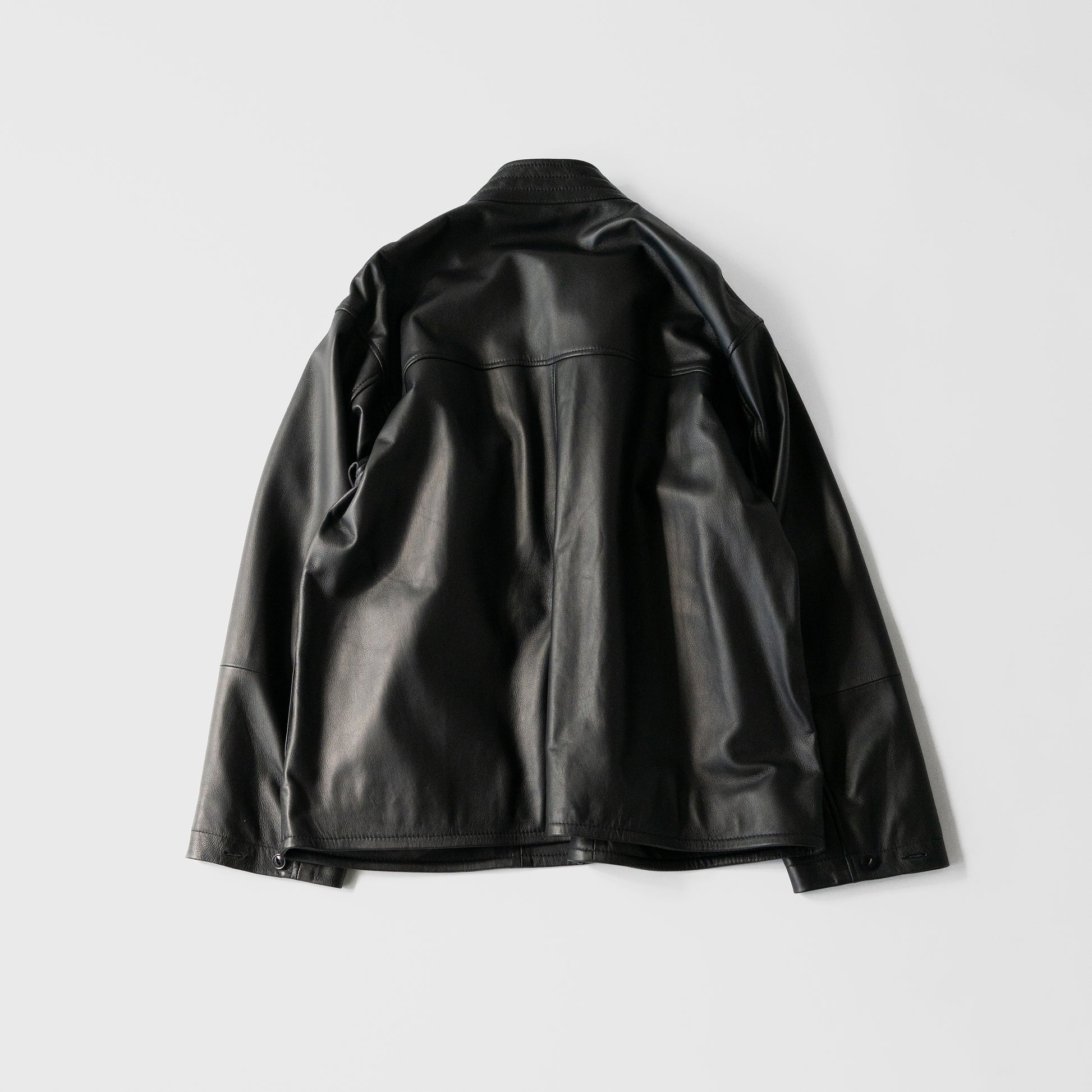 異なる国々のワークウェアーのエッセンスをミックスし、モダンなスタイルと機能性を兼ね備えたチャイナシャツジャケットになります。 Material:イギリスのシープレザーを限界の0.6mmすくことで柔らかなタッチ感を出しています。表面と裏面両方にナッパラン加工を施し、マットに仕上げ、程よく張り感が生まれスウェードとはまた違った着心地になっております。加工によりツヤを抑えて表革が苦手な方に着てもらいたいという思いで作りました。