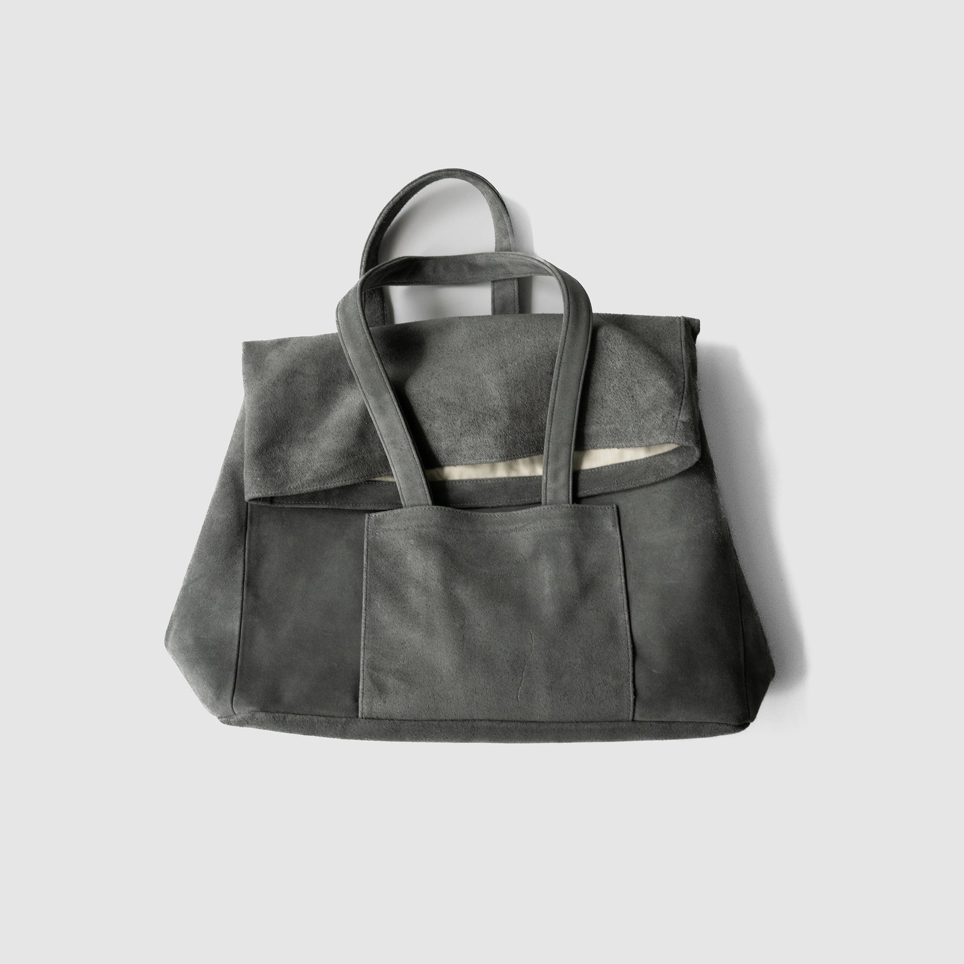 ペーパーバックをモチーフとし、フロント/ バック共に持ち手をつけ、トートバックのような形になっているフロント部分には、大きなパッチポケット、裏地にはヘリンボーン調のコットン生地を使用。最大限に上質なカウレザーを使用するため、ハギを極端に減らして、よりシンプルな印象に仕上げている。使用されているレザーは、国産レザーを使用した銀付きベロアになっており、上質な毛羽感と柔らかな革質が最大の特徴であり、ダブルフェイスとも呼ばる毛羽面の反対側は銀面が残ったものを採用しております。このタイプのメリットは毛羽が細かくなることと、丈夫さがあることです。