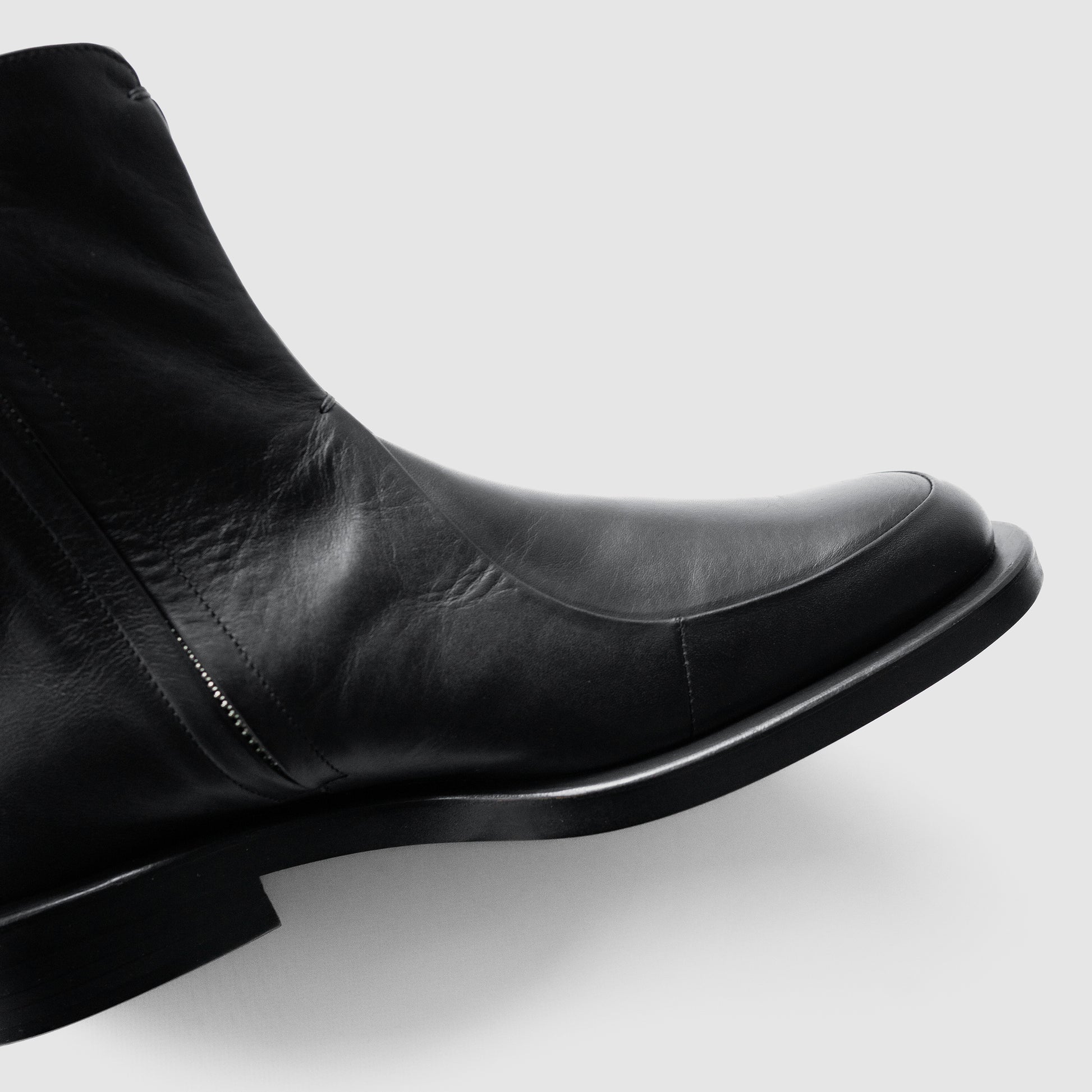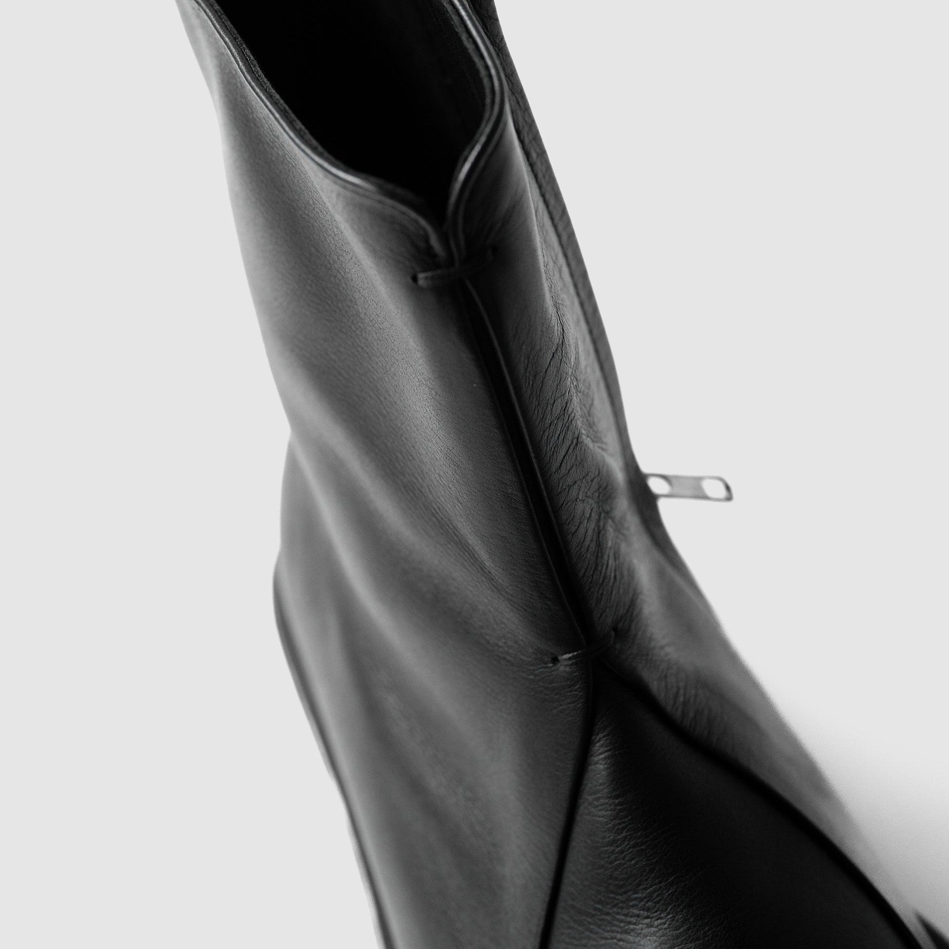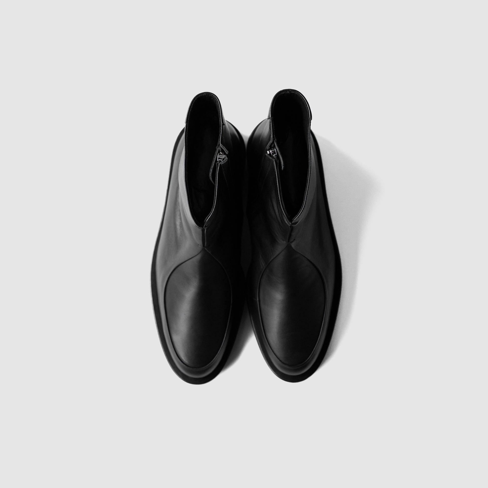 曲線から直線となり筒で融合する継ぎ目は手縫い糸で合わせ象徴に。内側にファスナーをもってくることで靴の構成をまとめている。