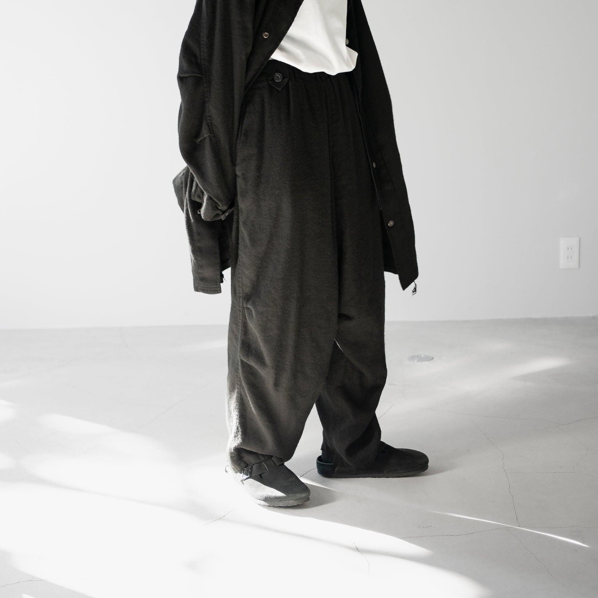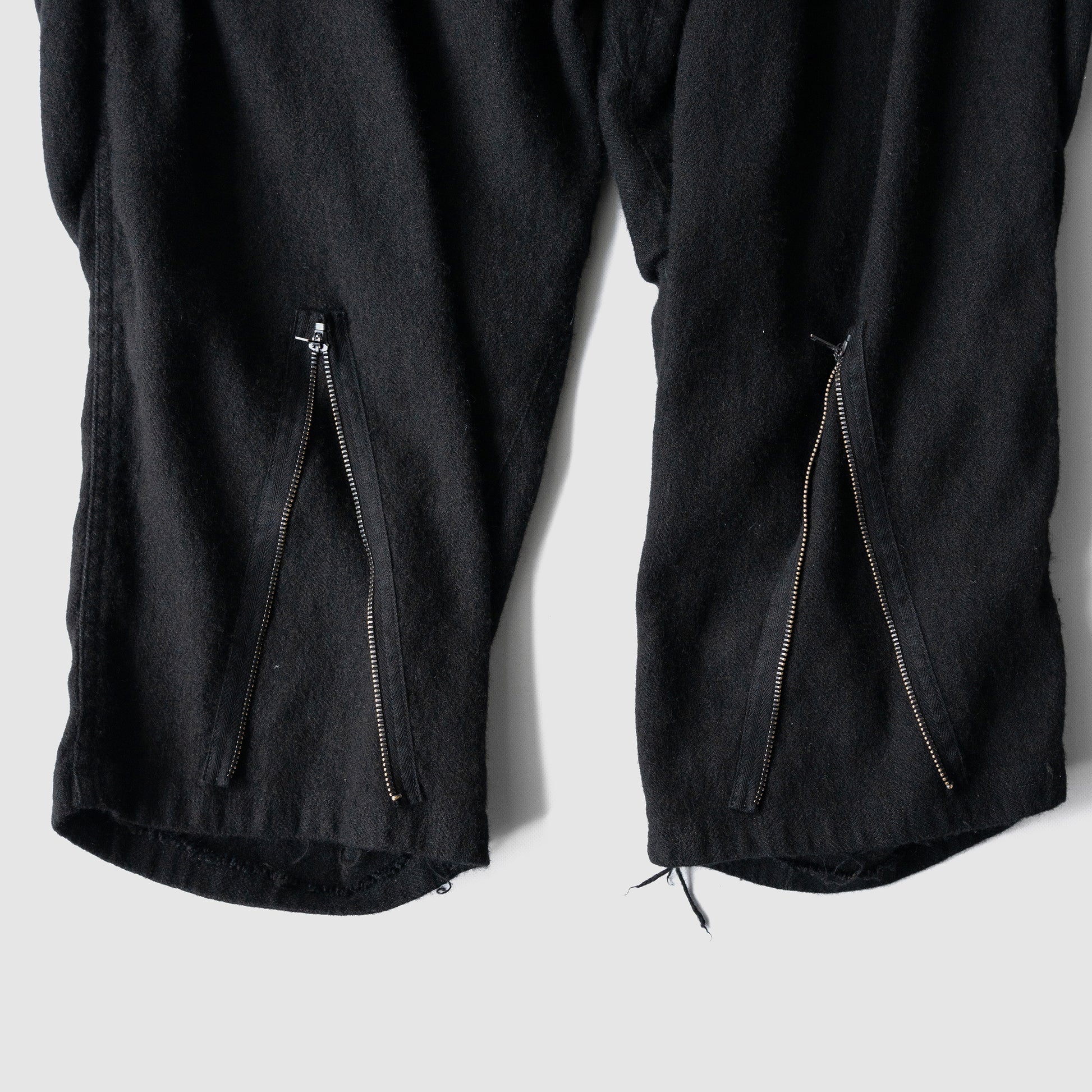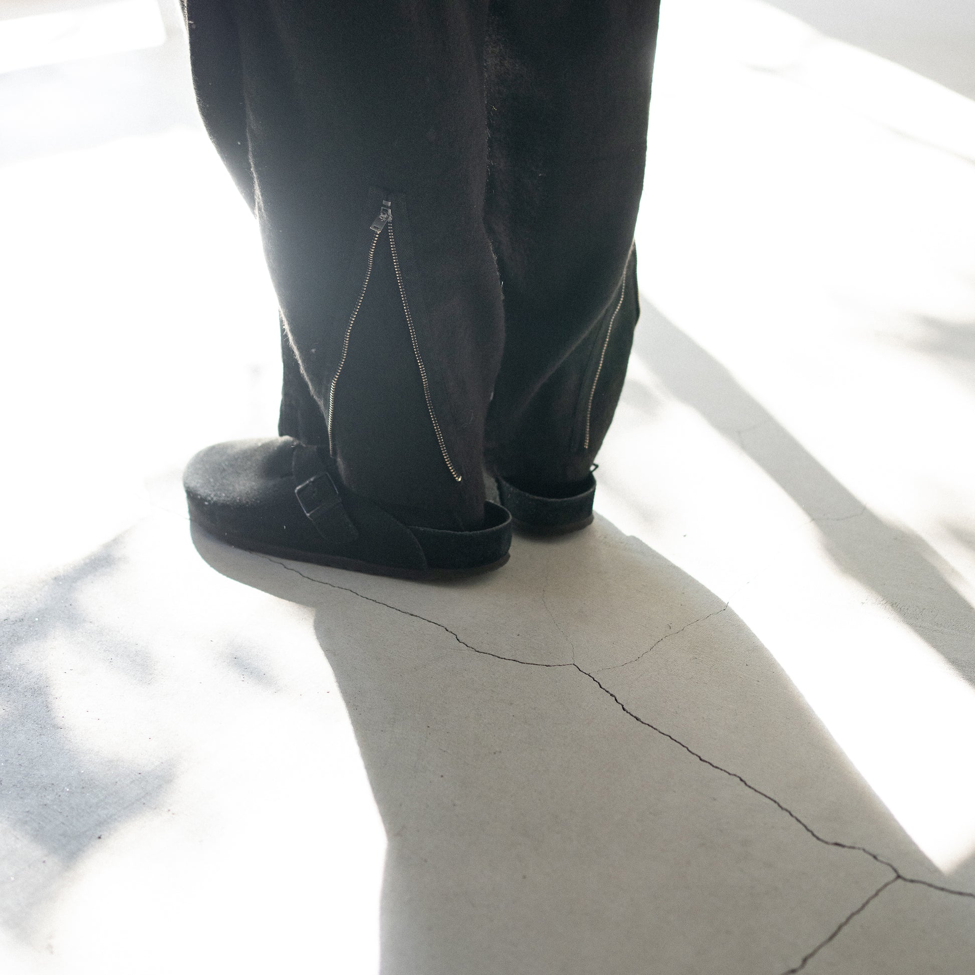 しっかり黒、たっぷりな股上に強めのテーパード。裾部分のジップ。膝周りのダーツによって立体的なシルエットを形成します。