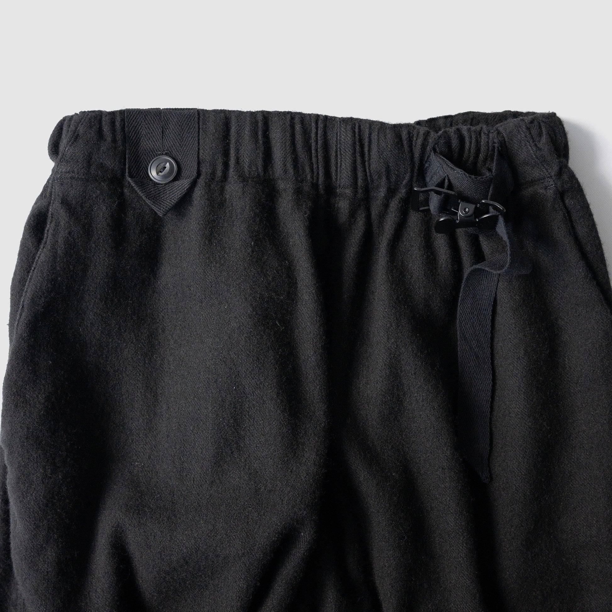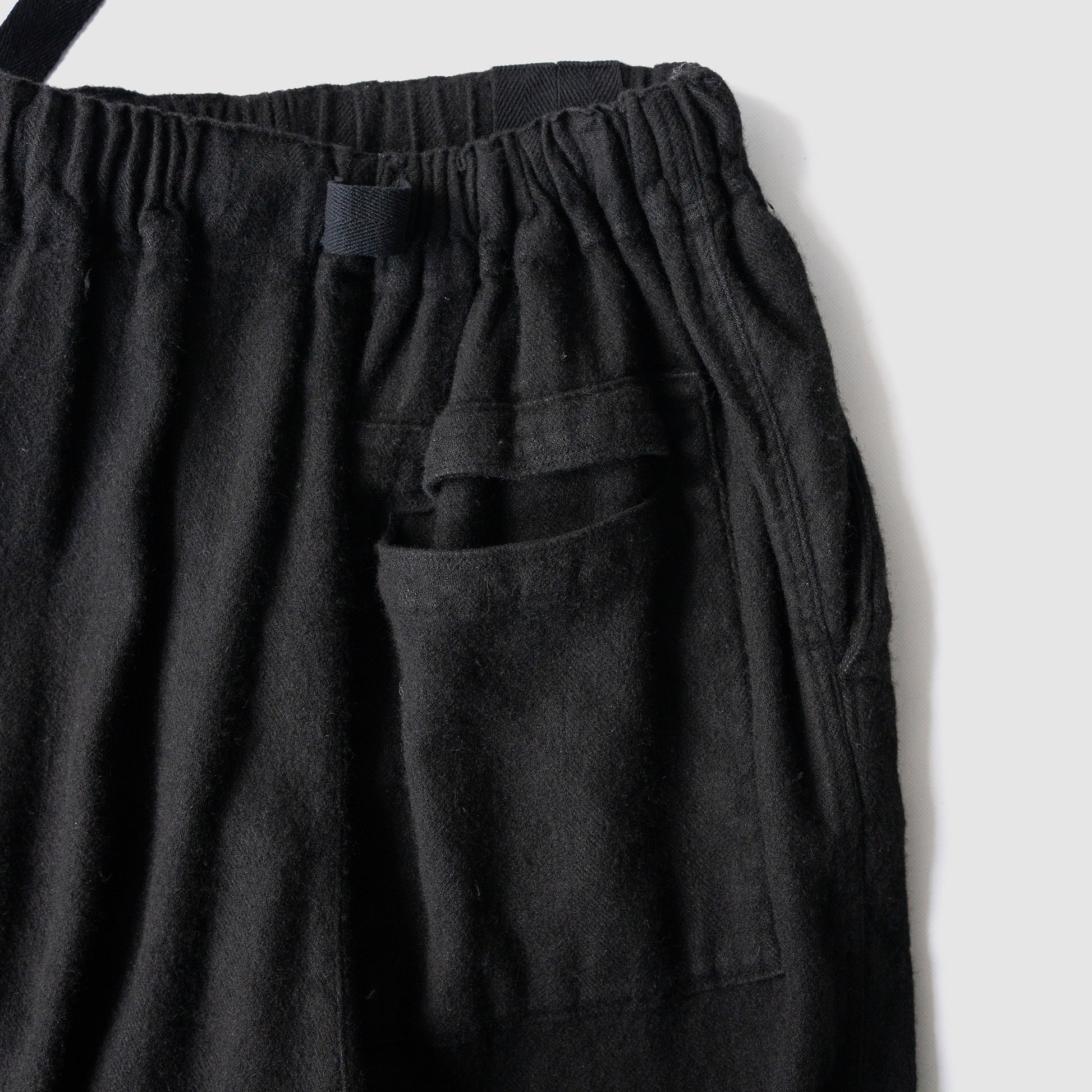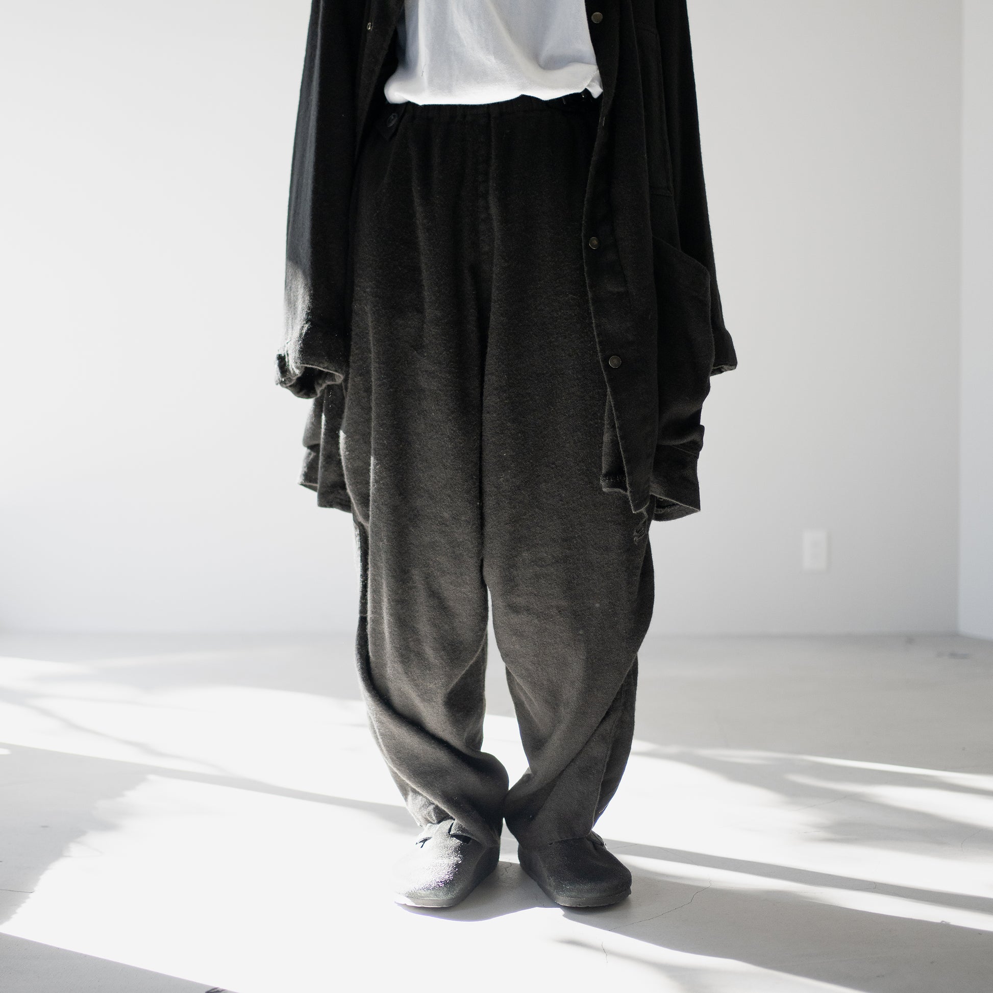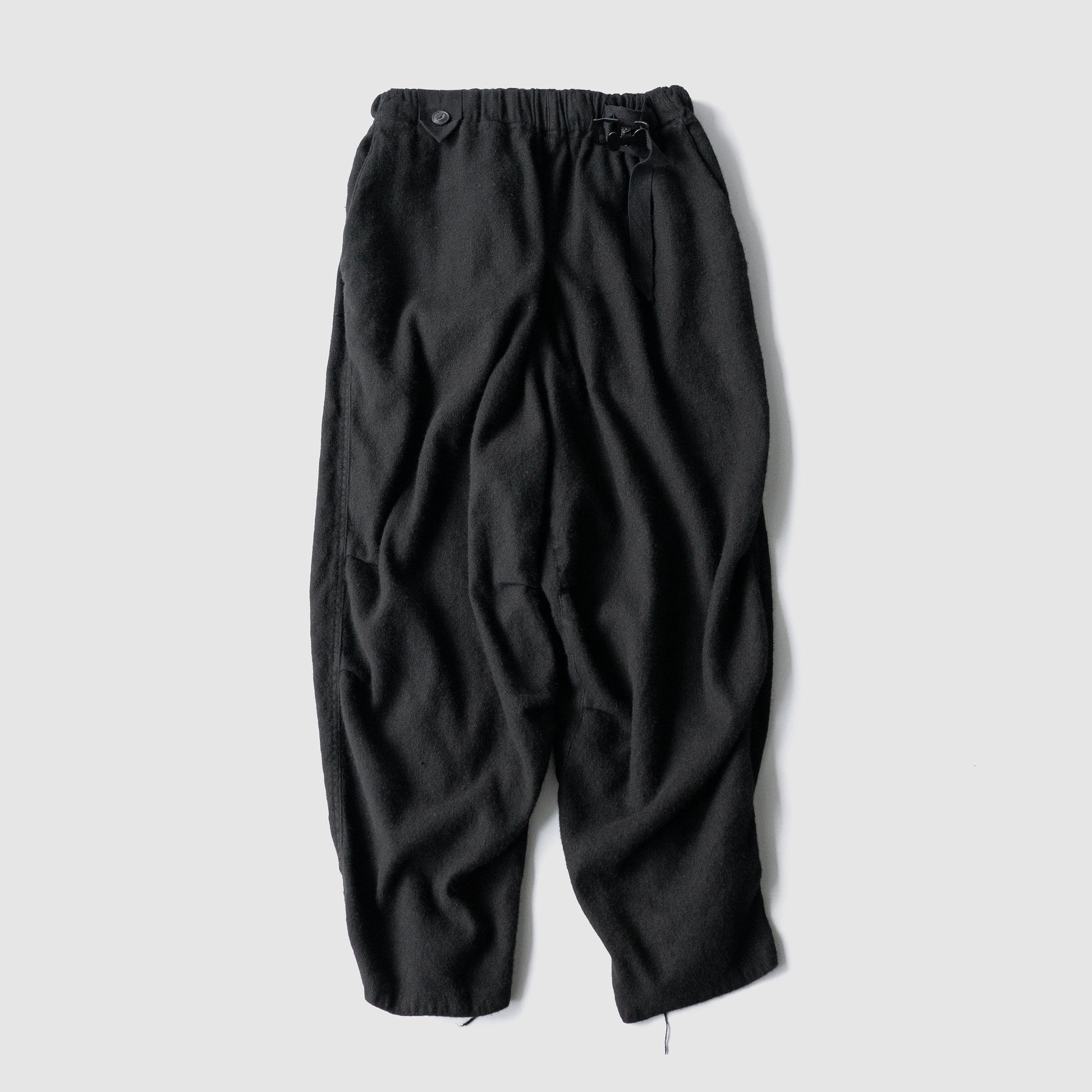 しっかり黒、たっぷりな股上に強めのテーパード。裾部分のジップ。膝周りのダーツによって立体的なシルエットを形成します。
