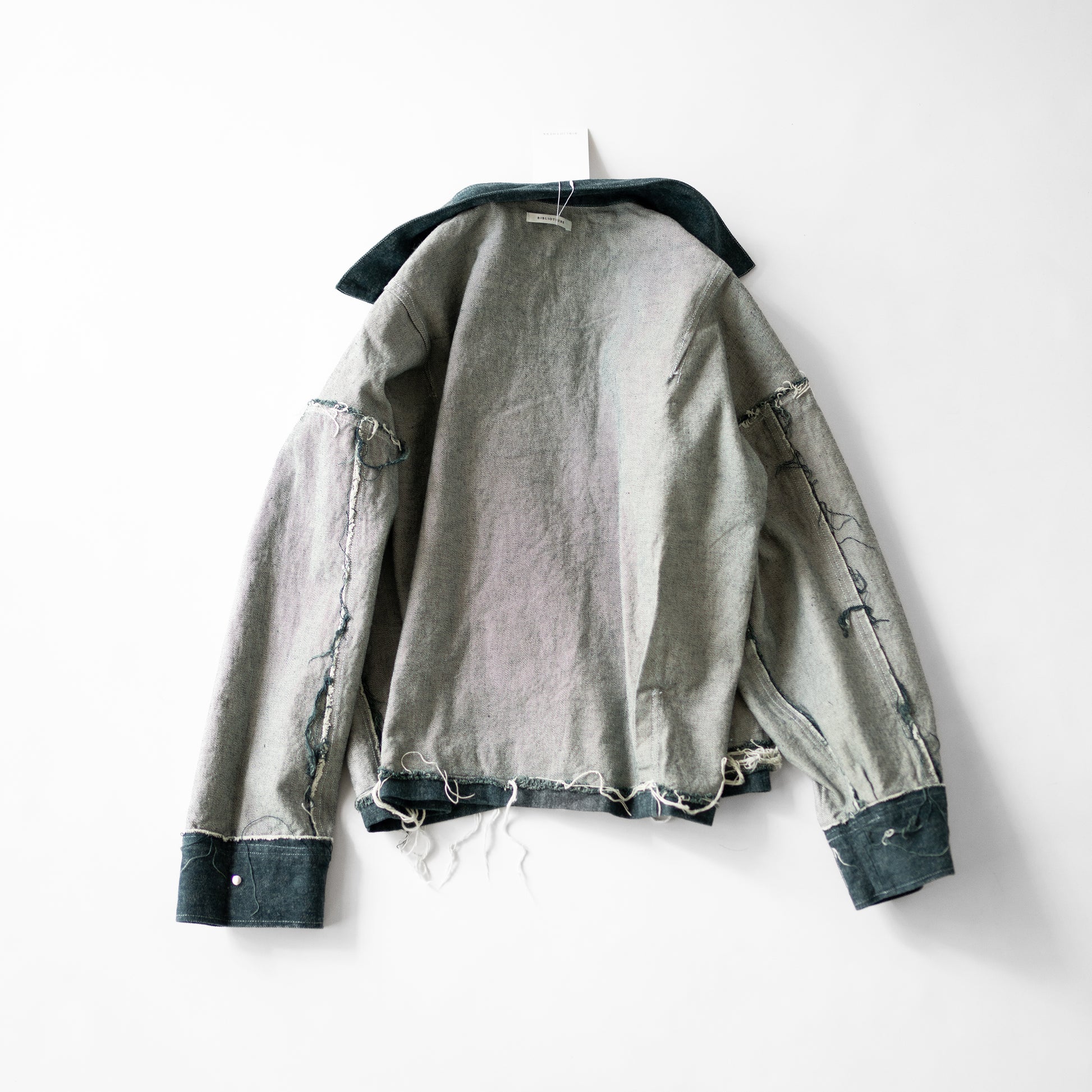 無造作に捉えられたこのジャケットは、裏の始末を全て切りっぱなしにすることで、表現したい動的な豊かさを出発点に、普通なものを大胆に描き出す。