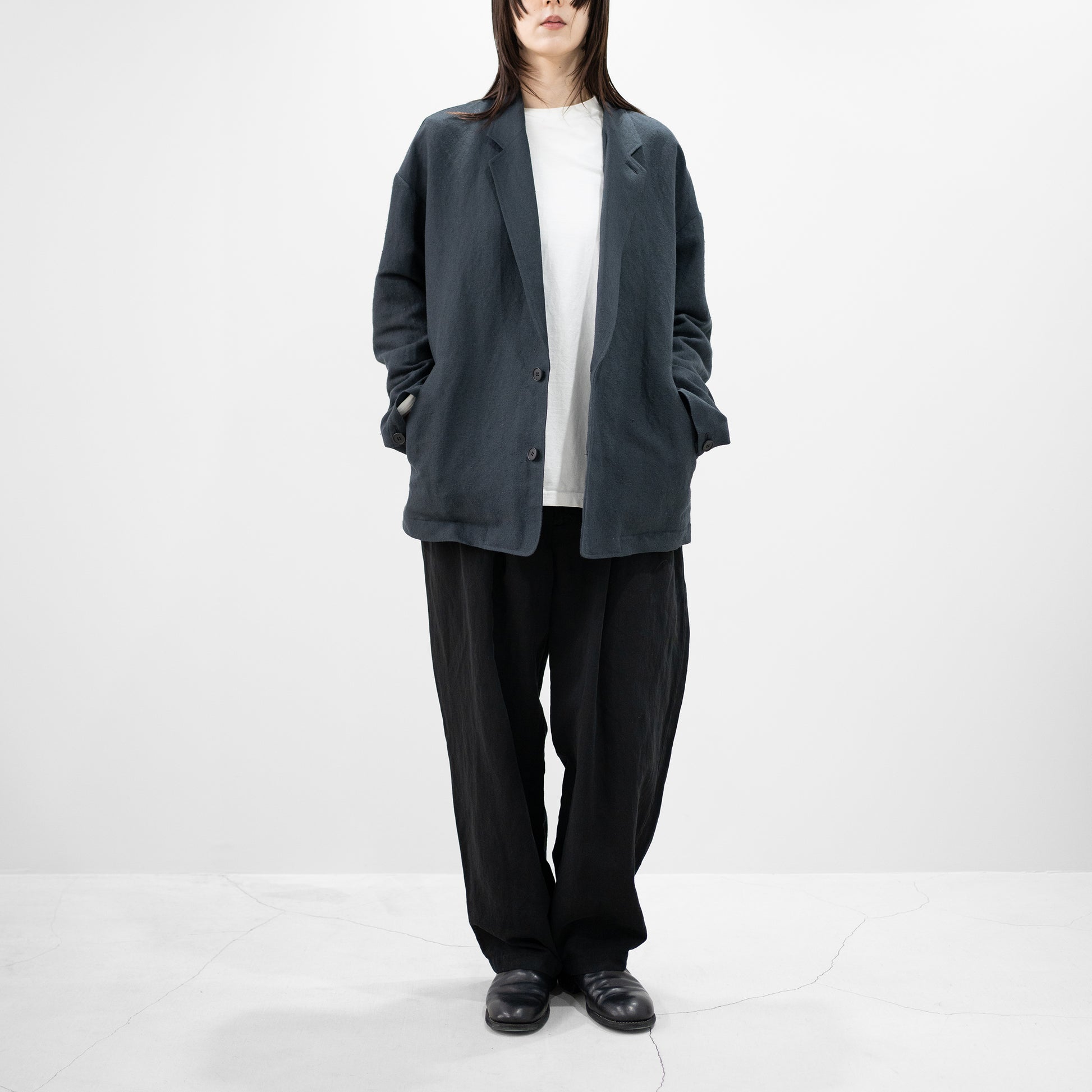 素材にはリネン×シルクの凹凸感、ネップ感の表情が特徴のオリジナル素材を使用。シルクノイル糸を使用している 為、柔らかな風合いが魅力。より個性的な素材を 目指しリネン混で作成。通気性と保温性も高め 幅広いシーズンで活用可能。ワッシャー加工により、自然な光沢感はありながら、やれた表情と腰のな い心地 よい肌触りになりました。