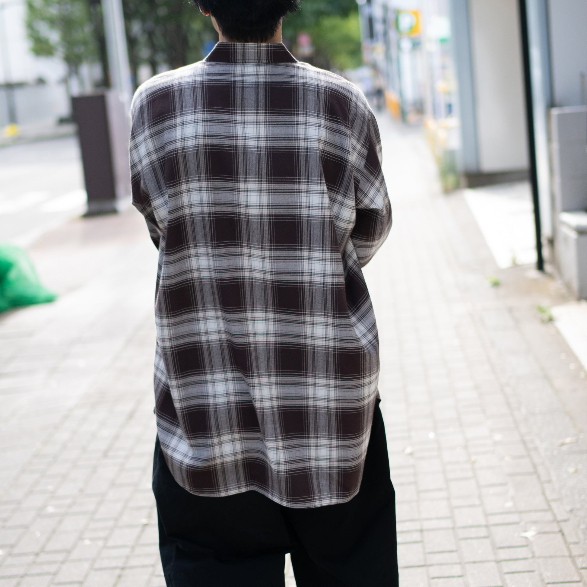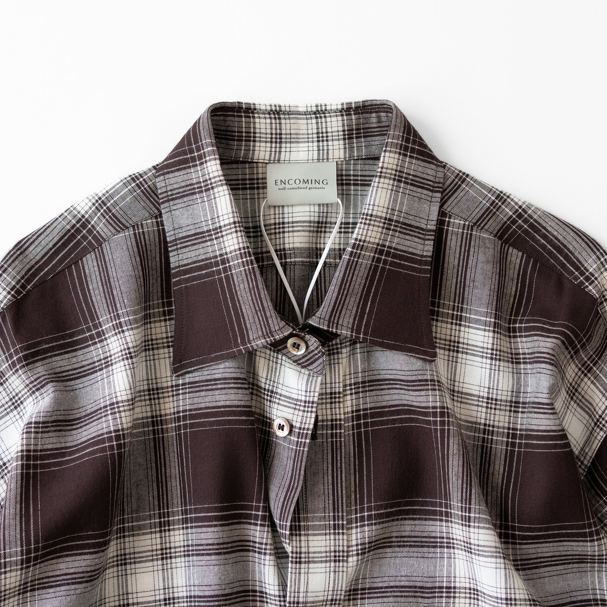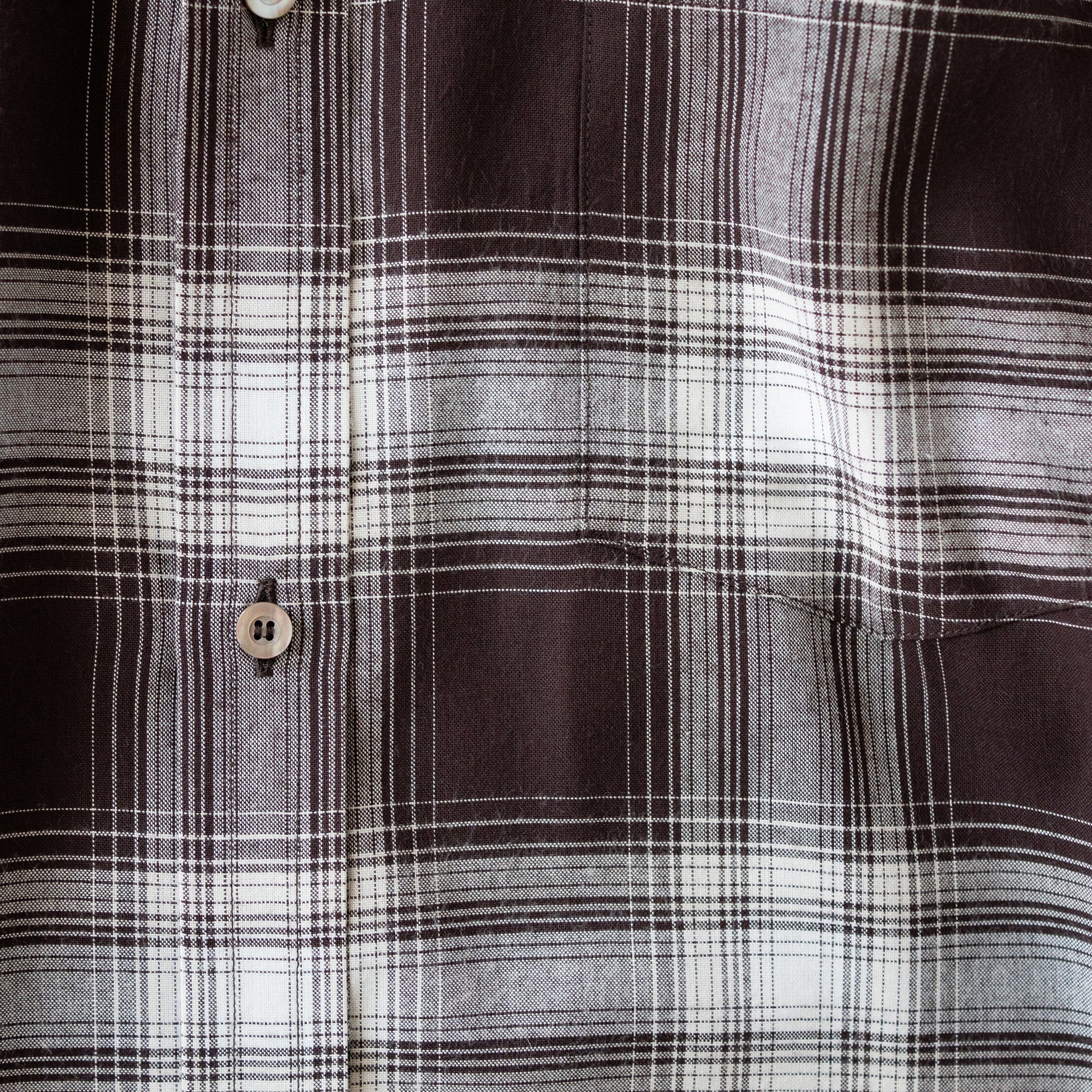 ENCOMINGとして継続的に制作しているロングスリーブシャツ。前見頃にポケットを配置し、よりデイリーに着用できる仕様を採用。アクションプリーツ・ヨークのないシンプルな後身頃ながら、アームホールのカービングをきつくすることにより、十分な可動域を確保している。前立ての仕様はクラシカルな英国仕様。本体で使用している生地は滑らかながら光沢感のあるレーヨン素材。濃淡のグラデーションが特徴的なチェック柄になっている。