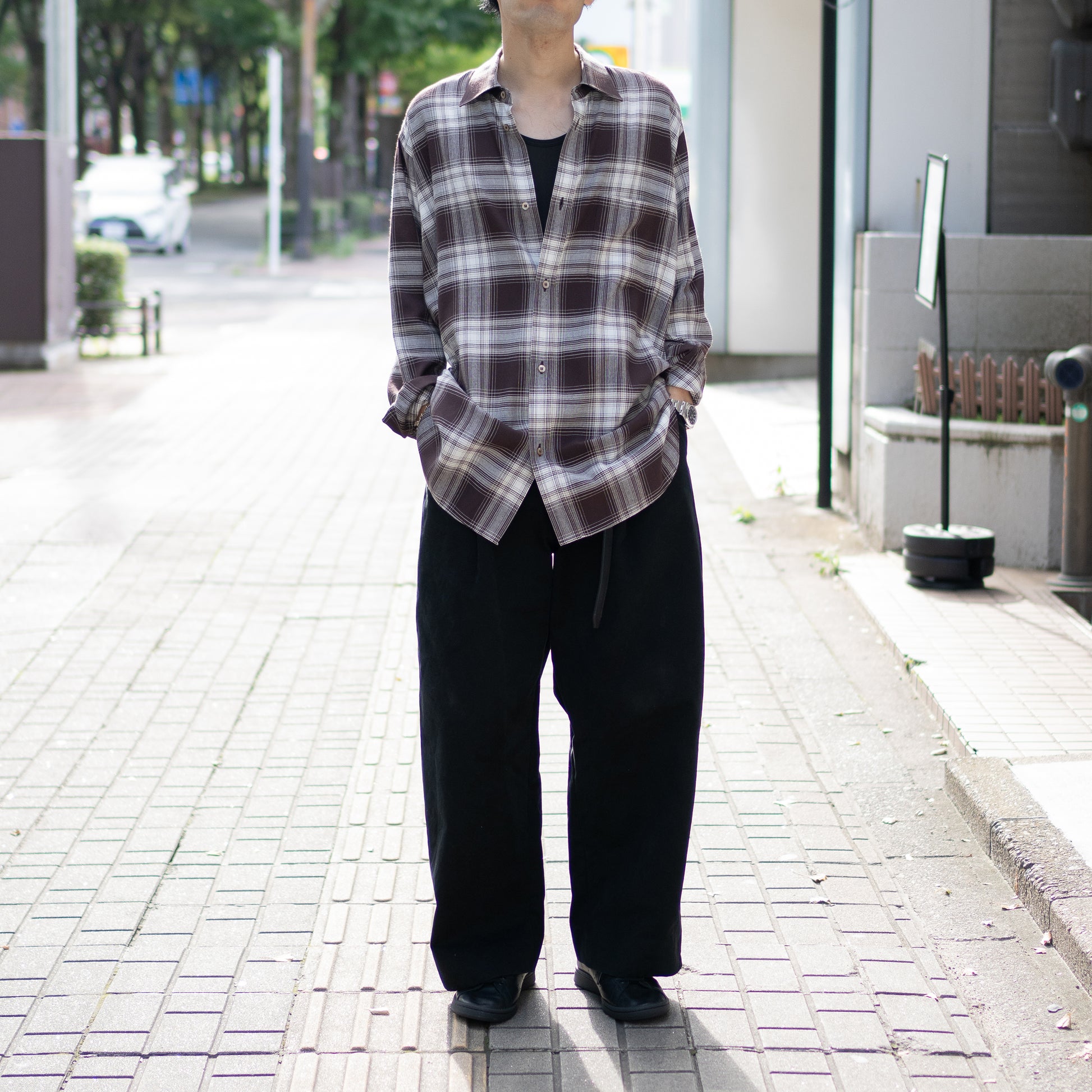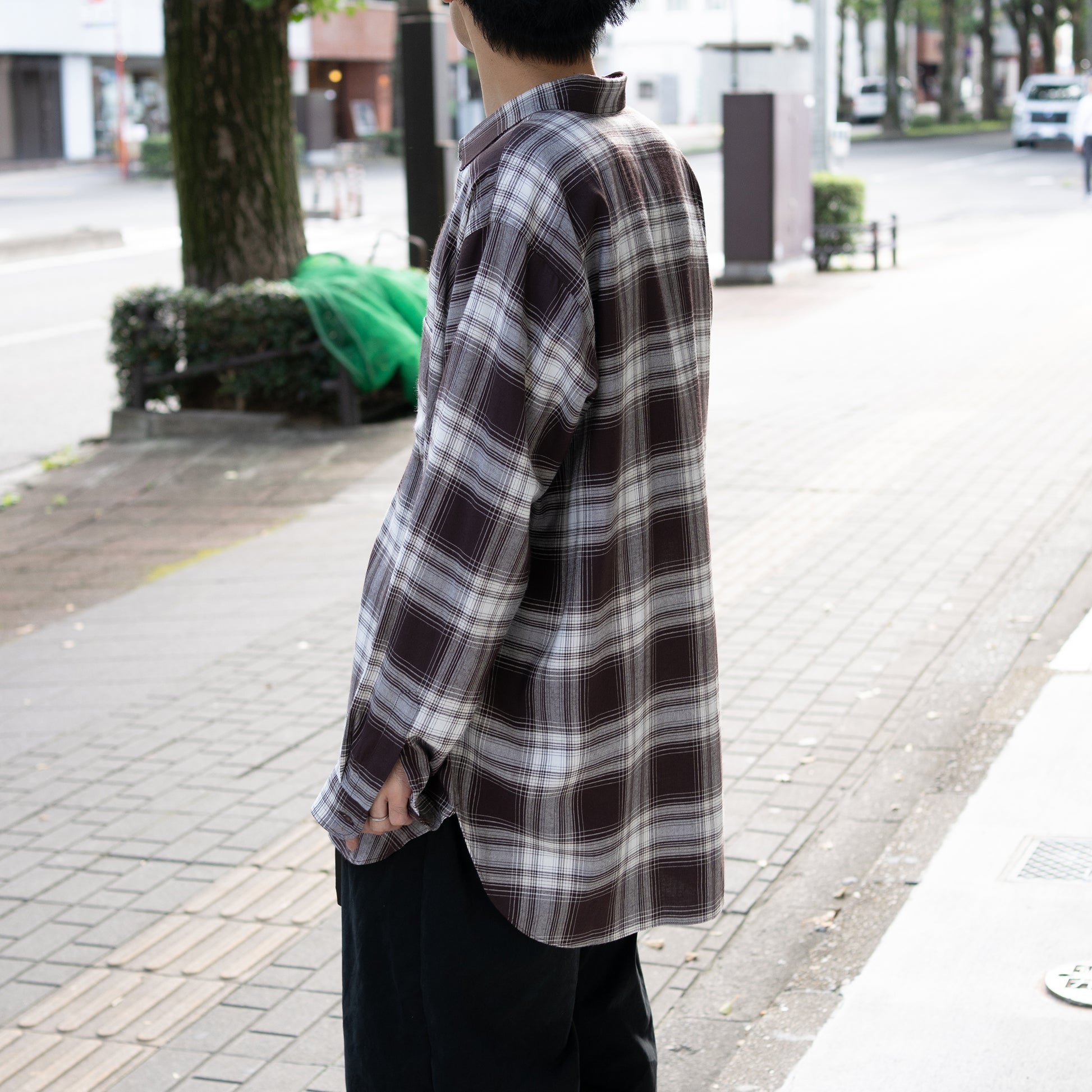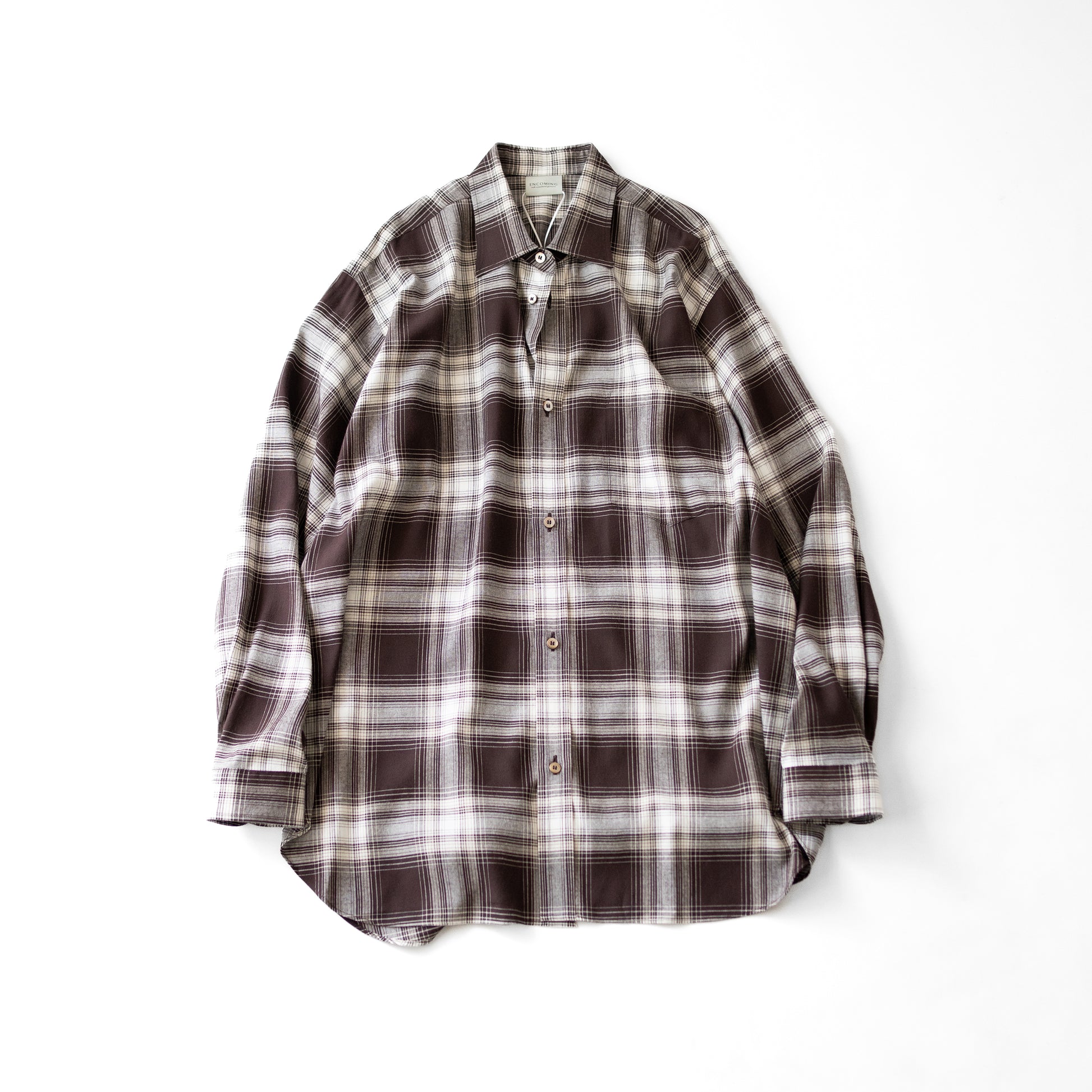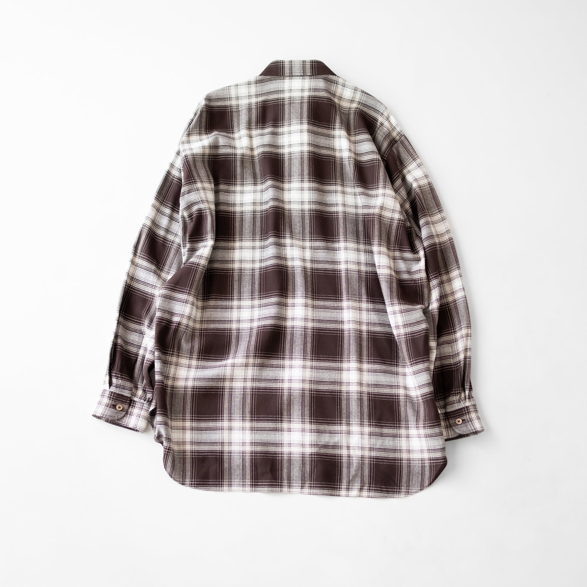 ENCOMINGとして継続的に制作しているロングスリーブシャツ。前見頃にポケットを配置し、よりデイリーに着用できる仕様を採用。アクションプリーツ・ヨークのないシンプルな後身頃ながら、アームホールのカービングをきつくすることにより、十分な可動域を確保している。前立ての仕様はクラシカルな英国仕様。本体で使用している生地は滑らかながら光沢感のあるレーヨン素材。濃淡のグラデーションが特徴的なチェック柄になっている。