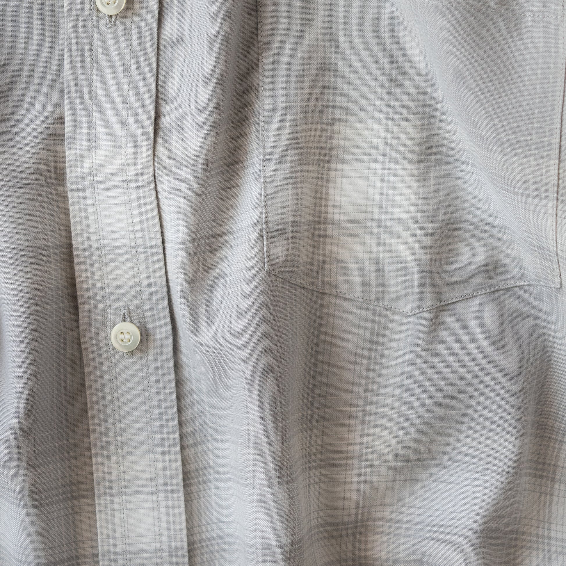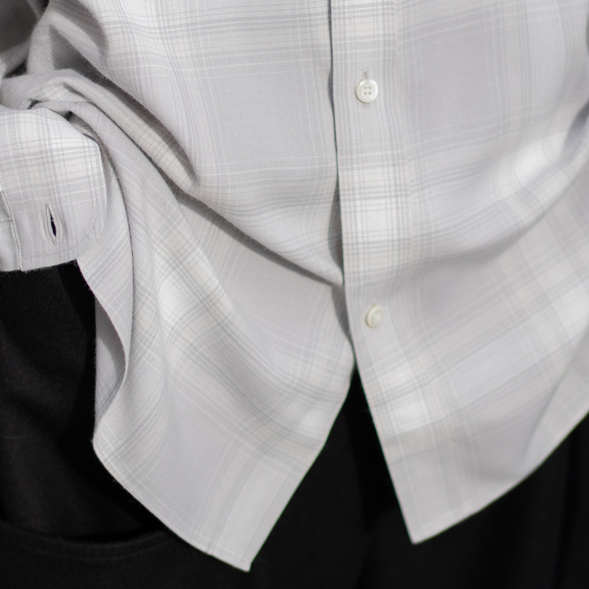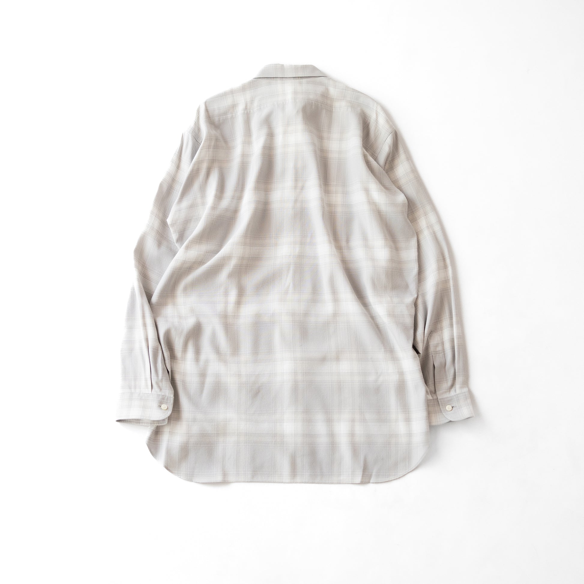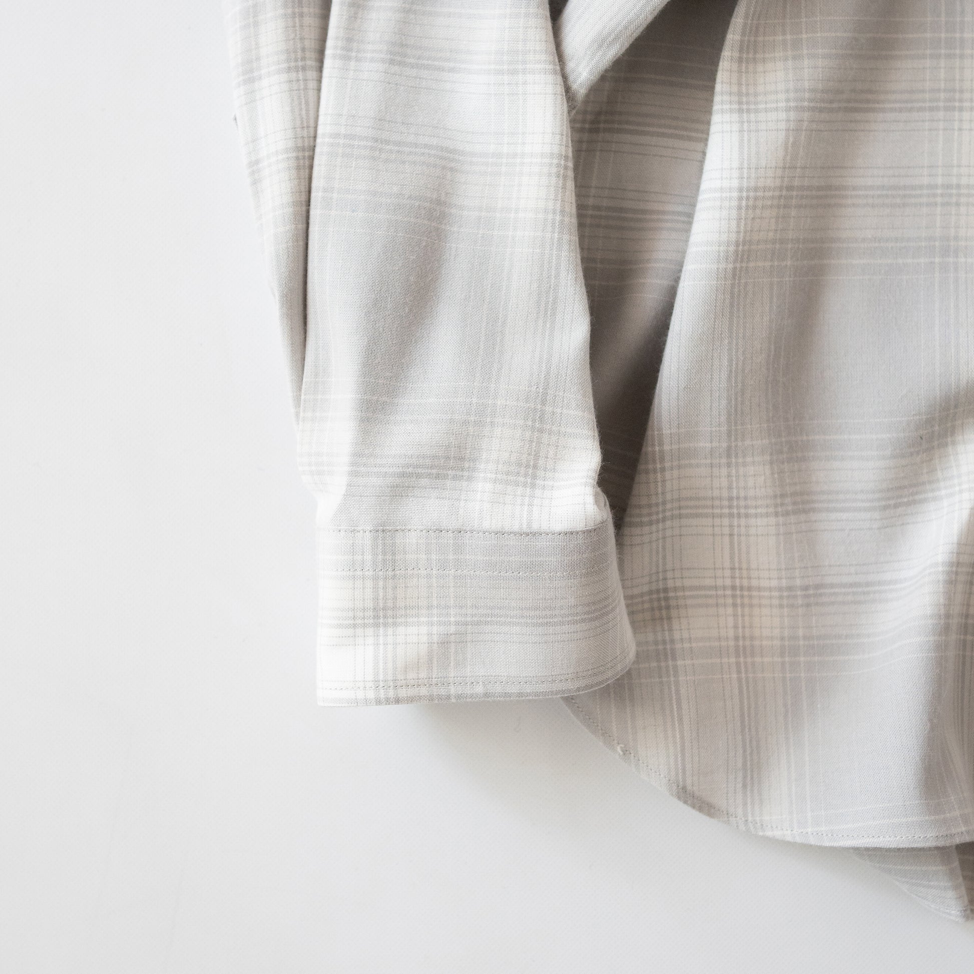 ENCOMINGとして継続的に制作しているロングスリーブシャツ。前見頃にポケットを配置し、よりデイリーに着用できる仕様を採用。アクションプリーツ・ヨークのないシンプルな後身頃ながら、アームホールのカービングをきつくすることにより、十分な可動域を確保している。前立ての仕様はクラシカルな英国仕様。本体で使用している生地は滑らかながら光沢感のあるレーヨン素材。濃淡のグラデーションが特徴的なチェック柄になっている。