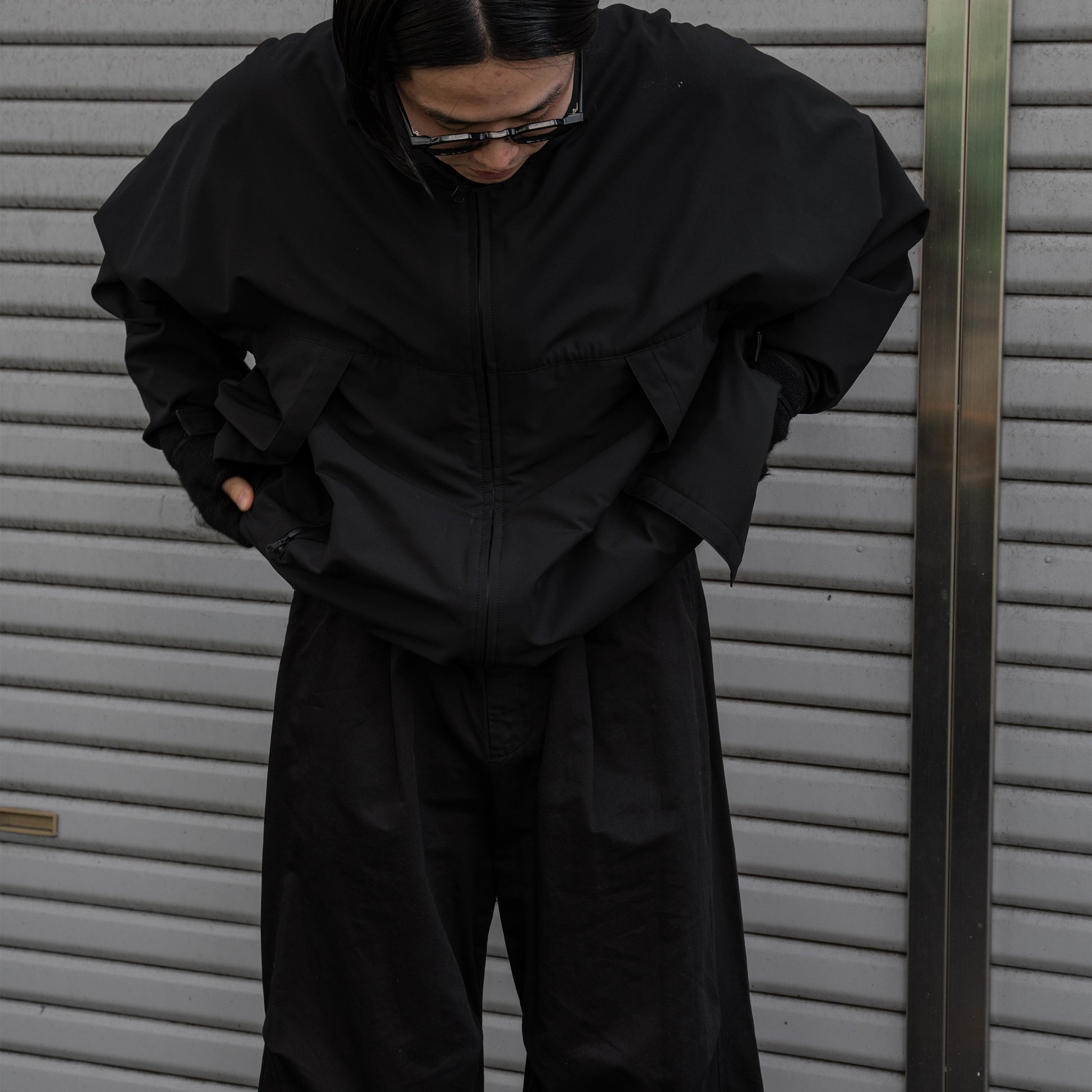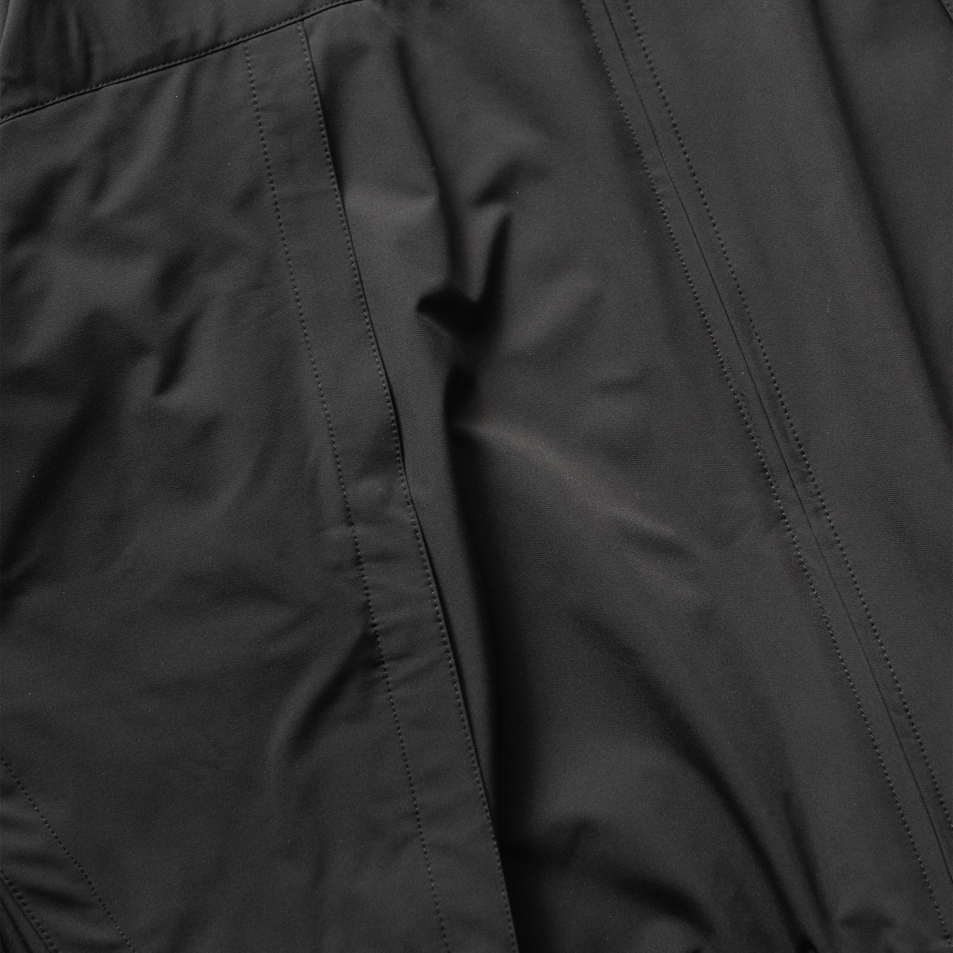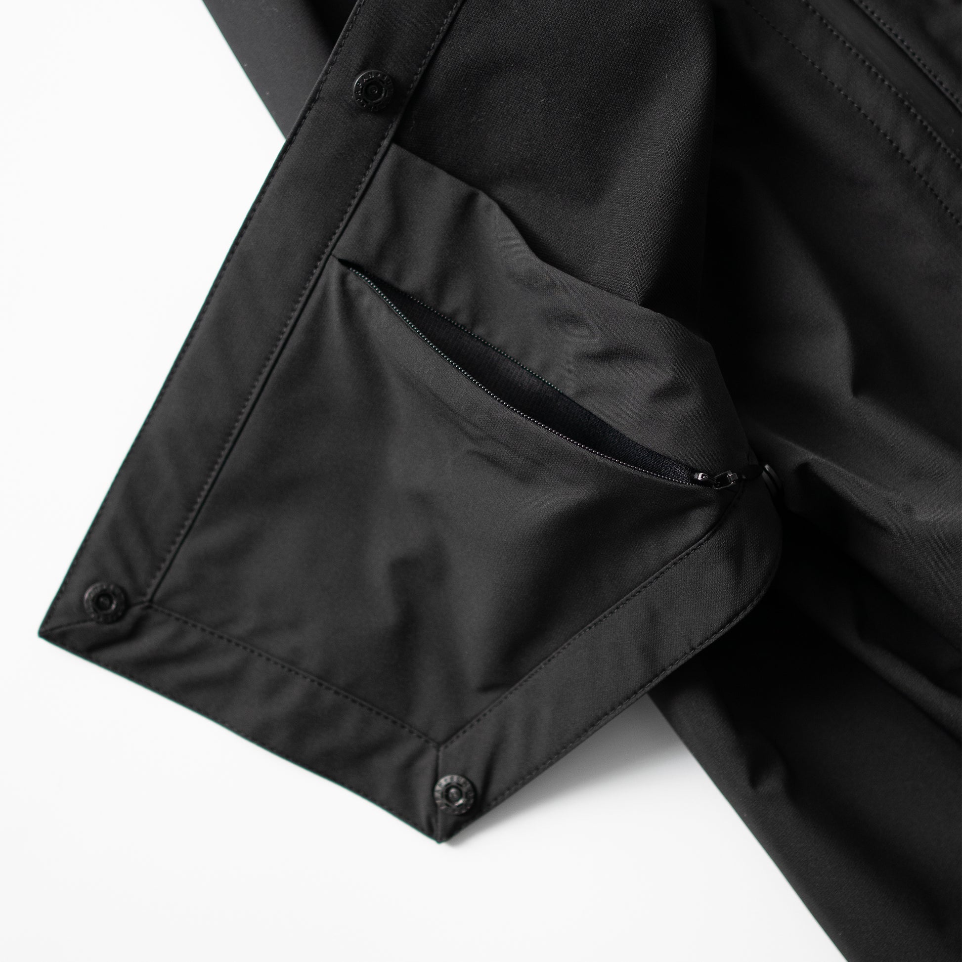 小雨や雪をしっかり弾く上に通気性も抜群。溜まった内側の蒸気を外へ発散します。身頃と袖の縫い目を極力なくした設計が特徴で、 ボディは1枚の裁断物から構成されています。ソフトシェルの特性上縫い目が無いに越したことはありません。 縫い目を無くす事で雨の侵入を防ぎ、衣服全体の軽量化にも繋がっています。両脇に大きな雨蓋フラップを配し、 身頃の止水ファスナーポケットを風雨から守ります。 フラップ裏にはコンシールジップ付きポケットを備えています。