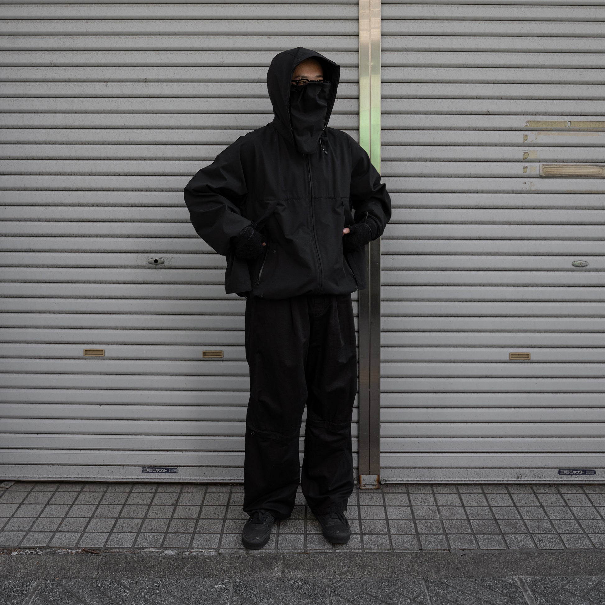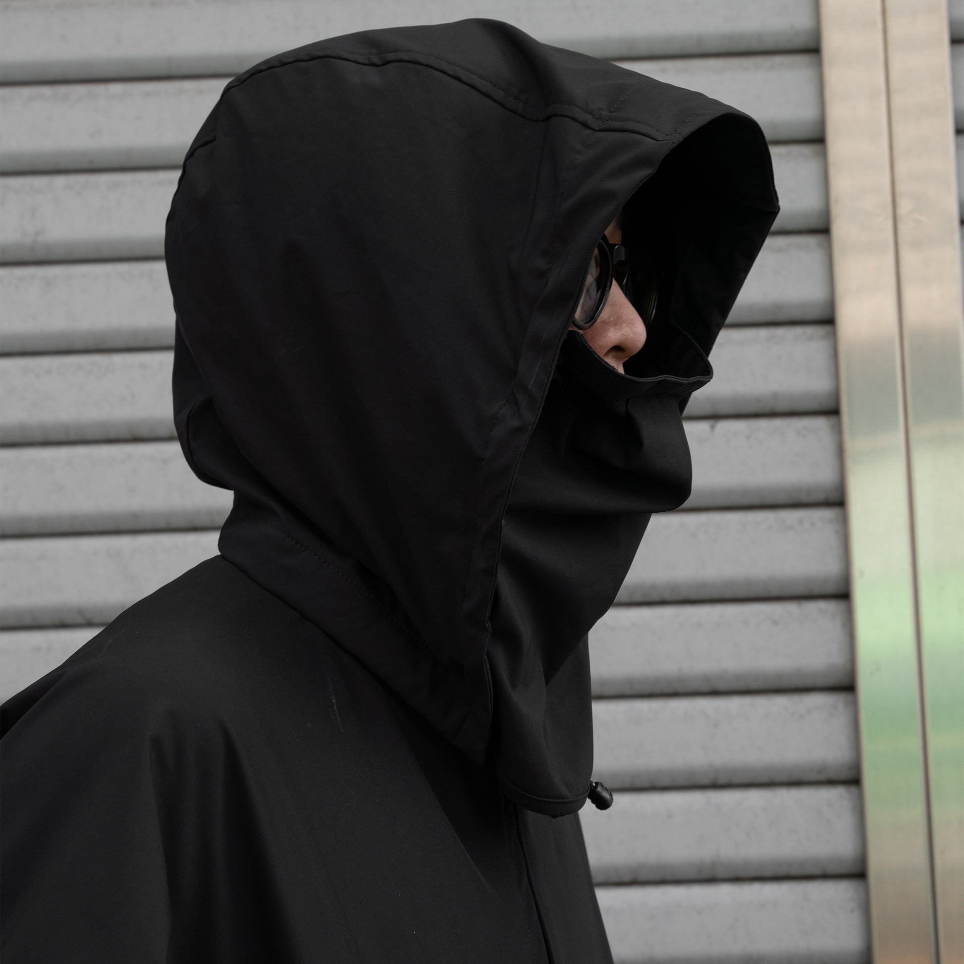 フードは立襟裏のドット釦で簡単に取り外せるデタッチャブルフード仕様。 更に荒天時にはフードに収納されているフェイスガードを装着しましょう。 視界を妨げない程度にしっかりと雨風から顔を守ってくれます。