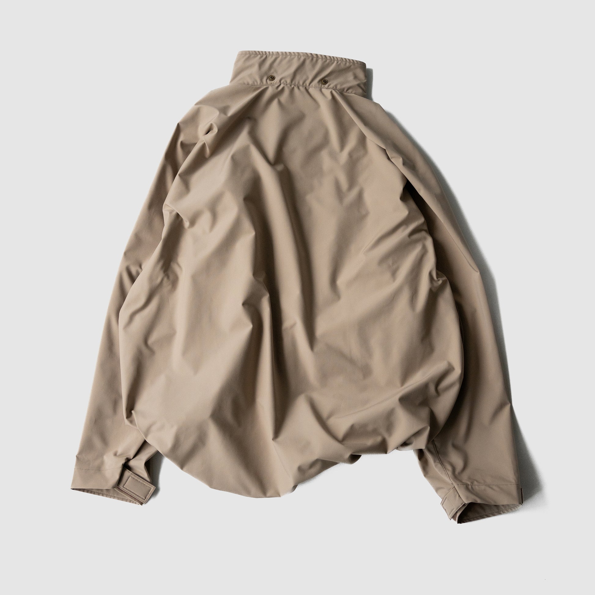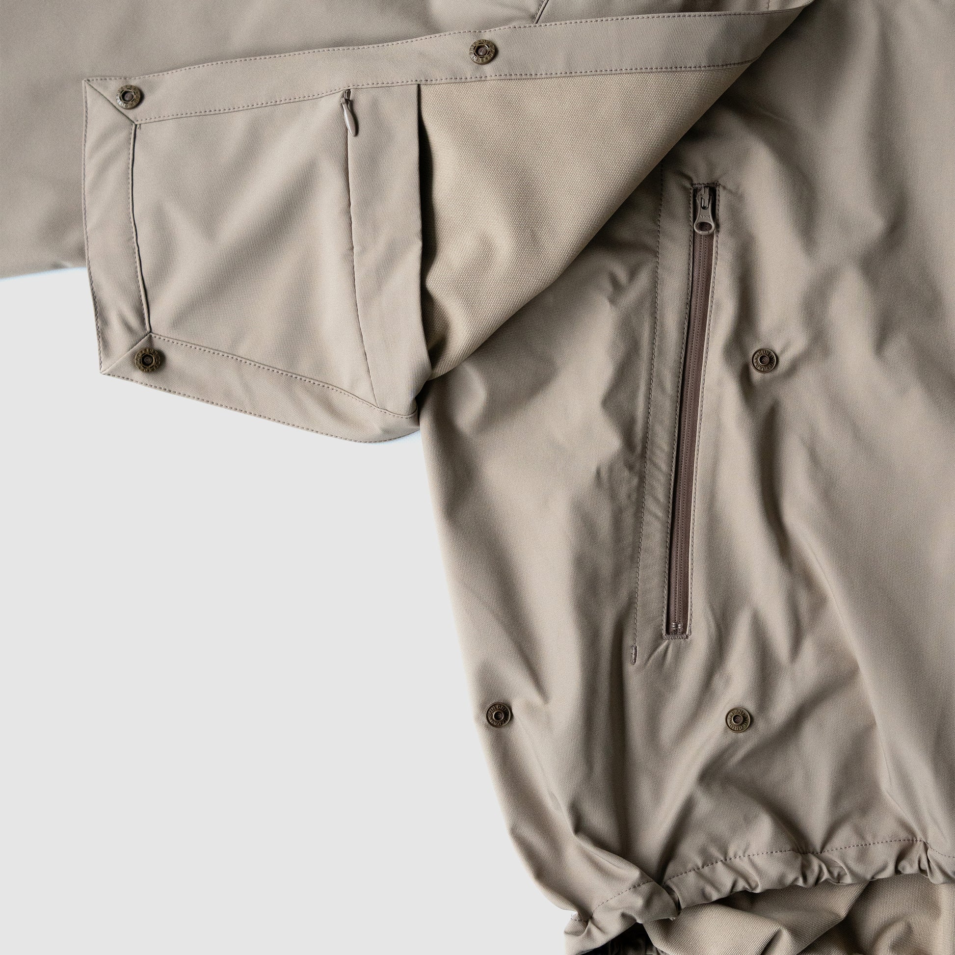 小雨や雪をしっかり弾く上に通気性も抜群。溜まった内側の蒸気を外へ発散します。身頃と袖の縫い目を極力なくした設計が特徴で、 ボディは1枚の裁断物から構成されています。ソフトシェルの特性上縫い目が無いに越したことはありません。 縫い目を無くす事で雨の侵入を防ぎ、衣服全体の軽量化にも繋がっています。両脇に大きな雨蓋フラップを配し、 身頃の止水ファスナーポケットを風雨から守ります。 フラップ裏にはコンシールジップ付きポケットを備えています。