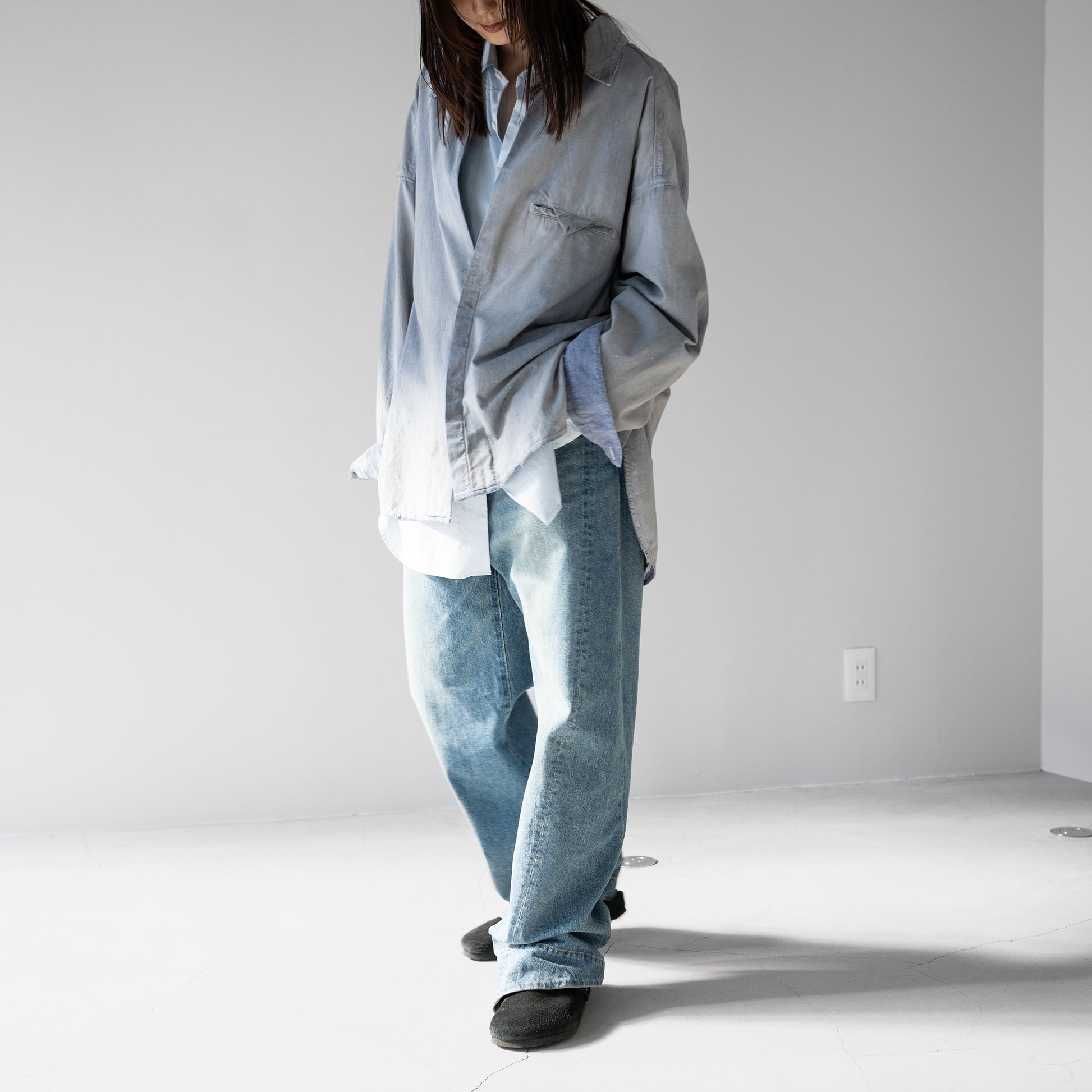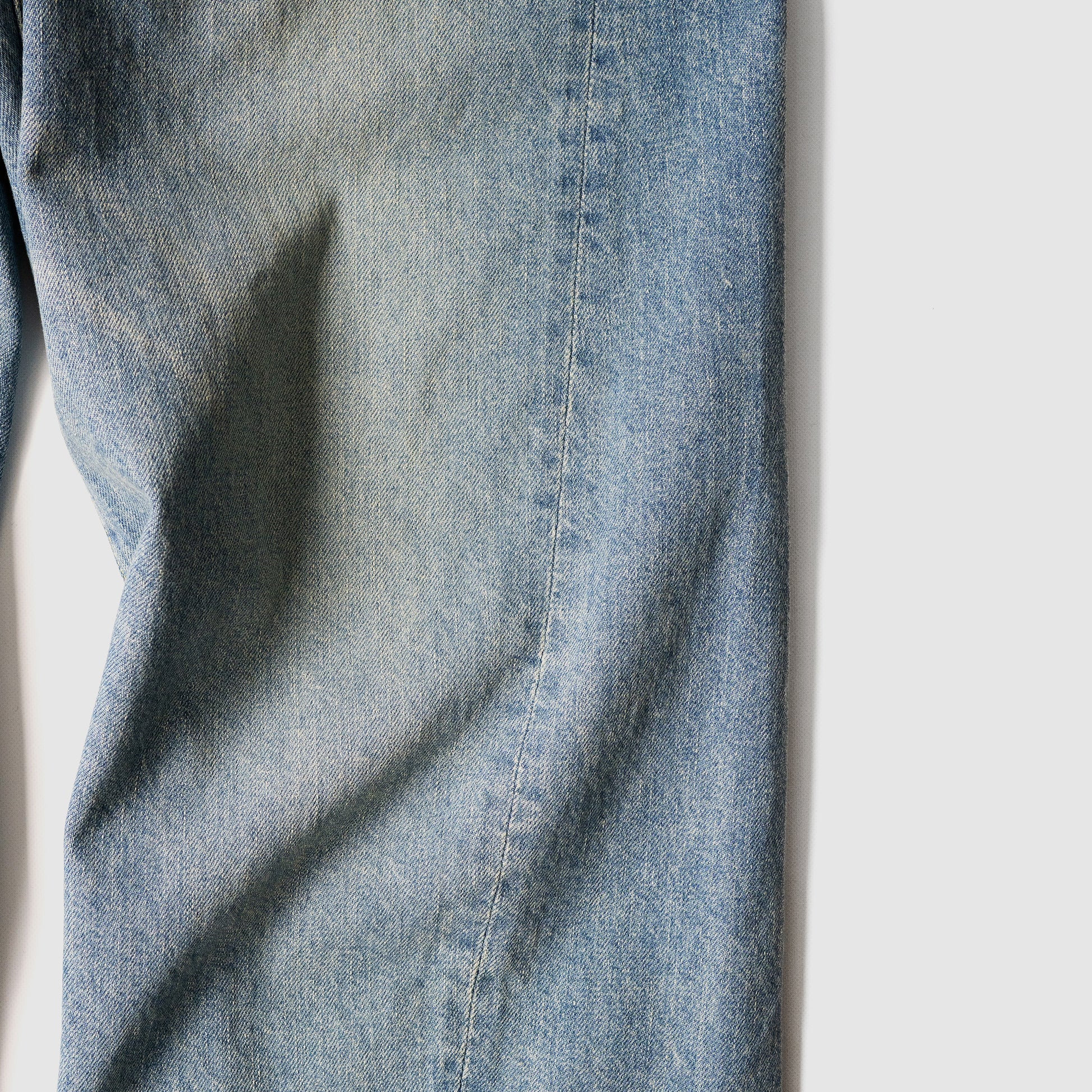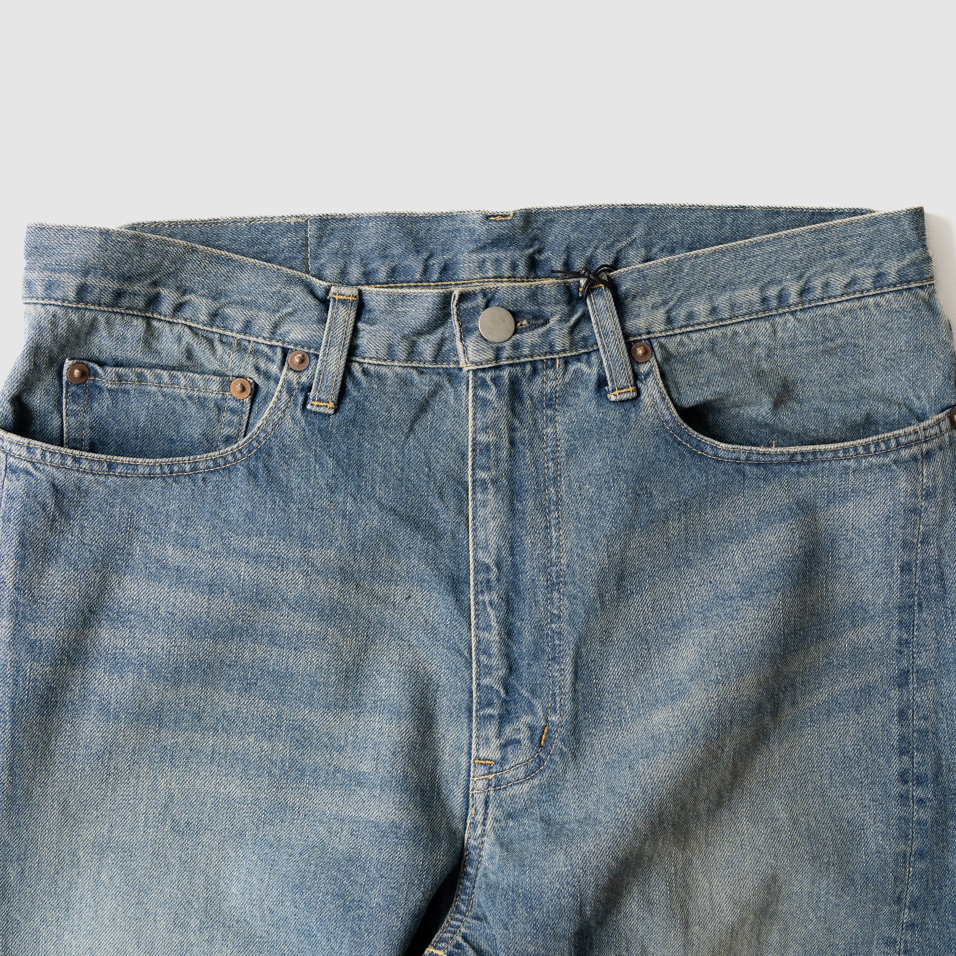 ストーンウォッシュ、ブリーチ、オーバーダイ、吹付け、手作業によるダメージ感等様々な加工過程を施し奥行きのあるデニムの表情を出している。