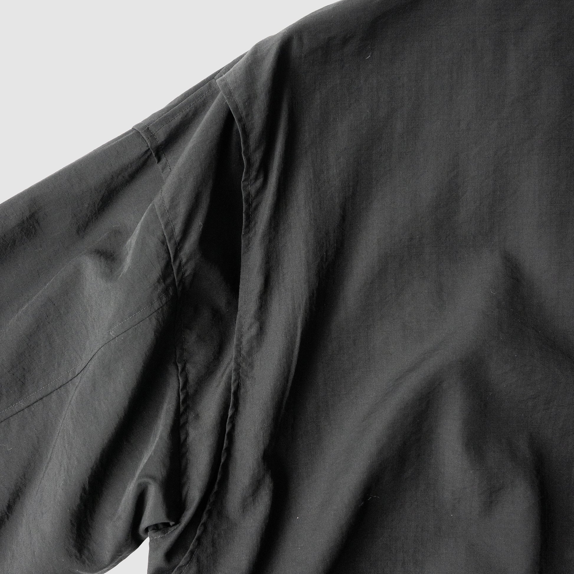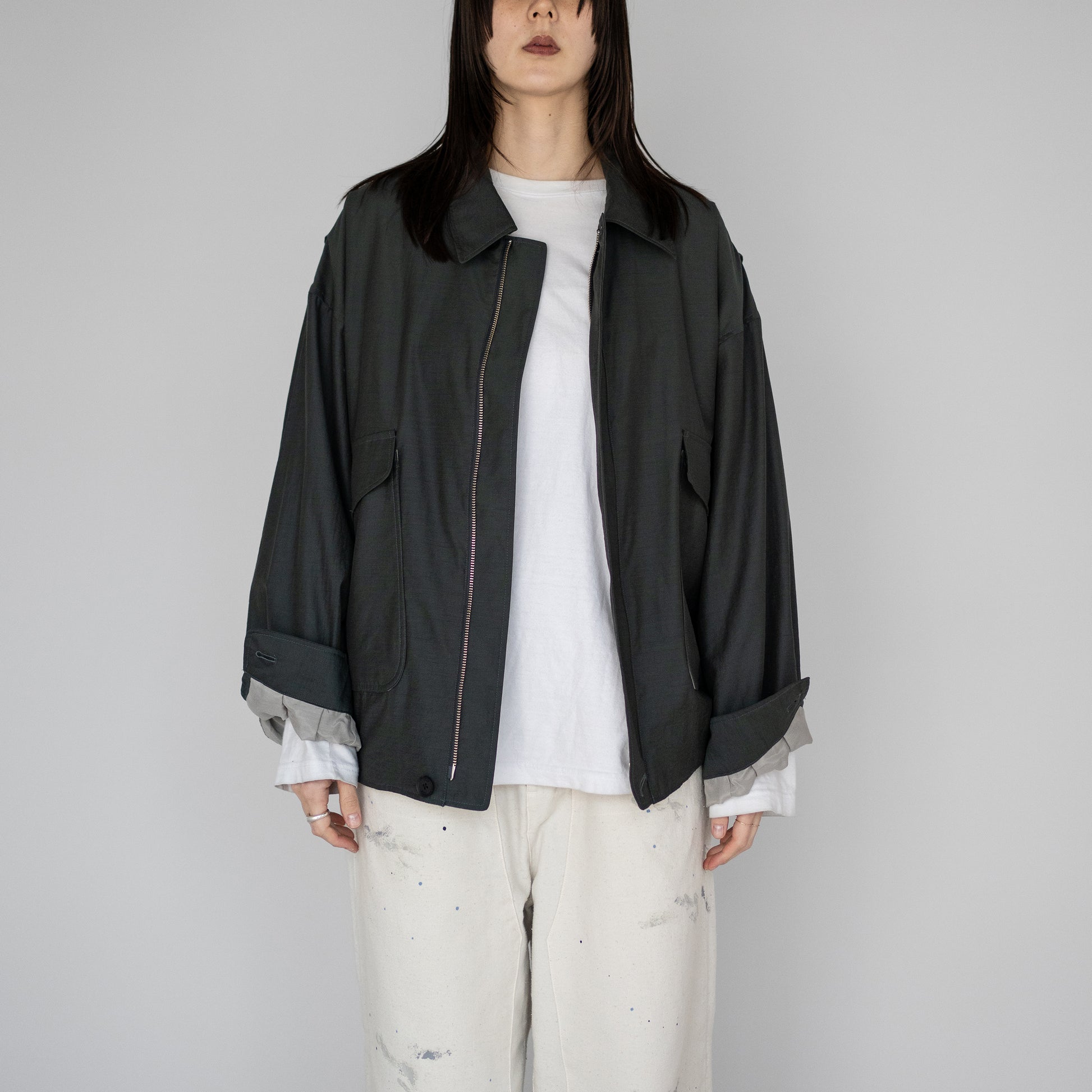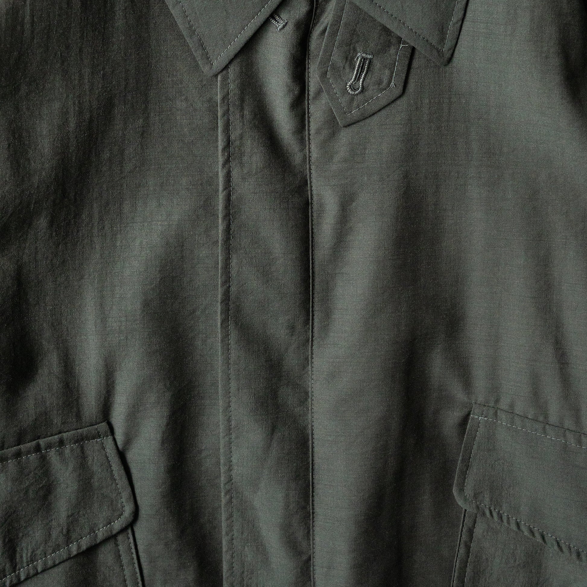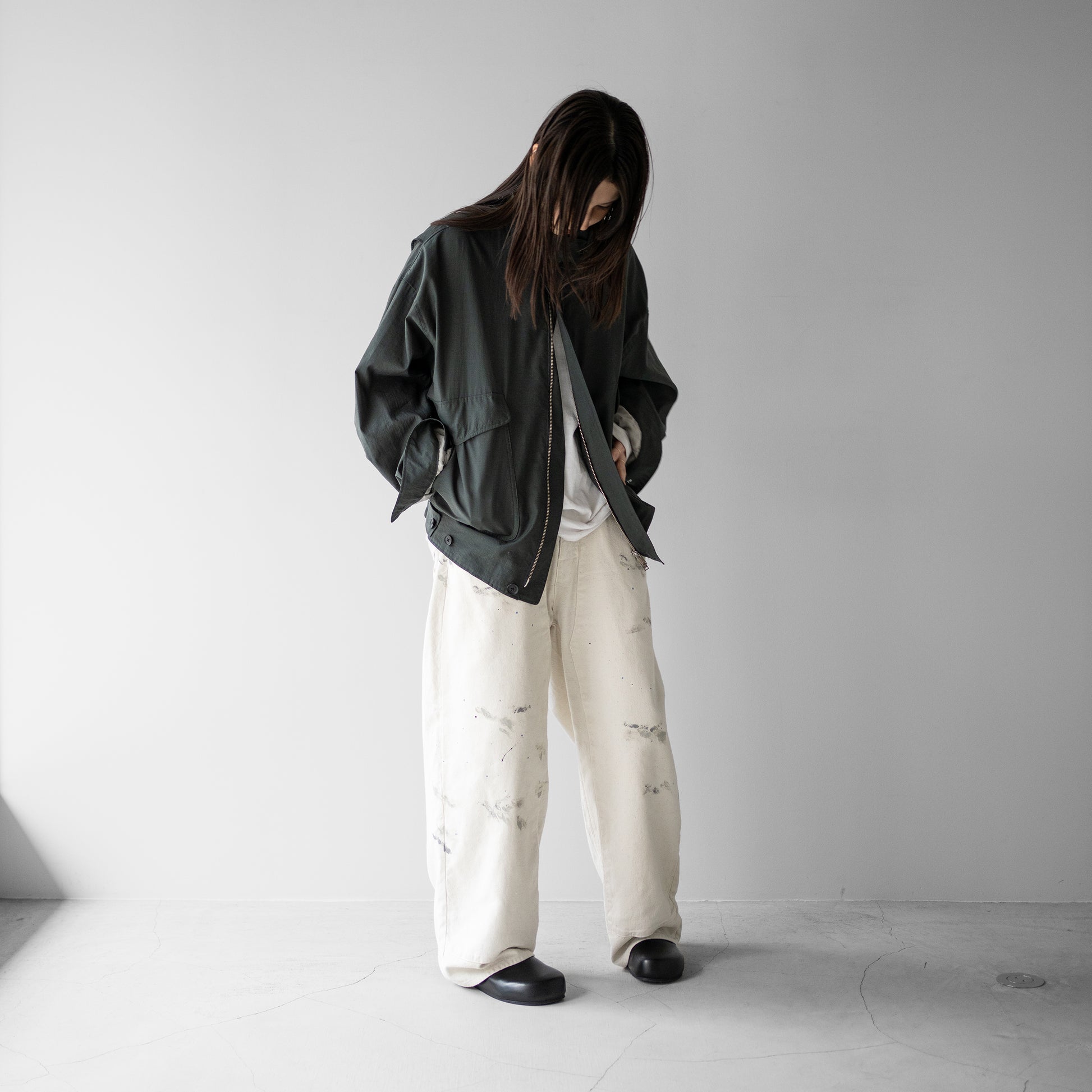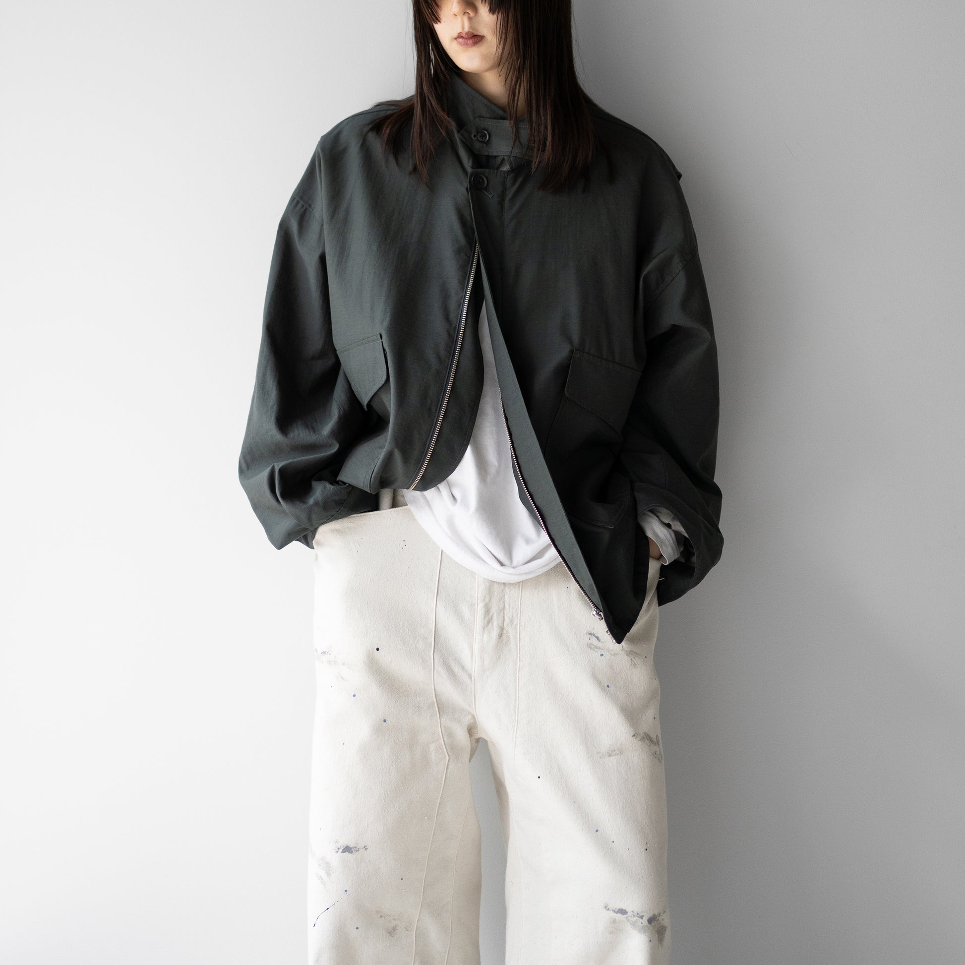 ウールナイロンポプリン素材を使用したA-2のフライトジャケット。25SSのナイロンツイルよりさらに軽く、清涼感を持たせています。カジュアルさを無くす様によりミニマルに、袖口、裾のリブは無くし共地にし、後ろ身頃裾は平ゴムで絞り、前身頃裾はボタンでアジャスト出来るタブを追加しています。腰ポケットも通常よりかなり大きくしてインパクトを持たせ、アクションプリーツで可動域を大きくとっています。衿にはボタンで着脱出来るチンタブ付きです。