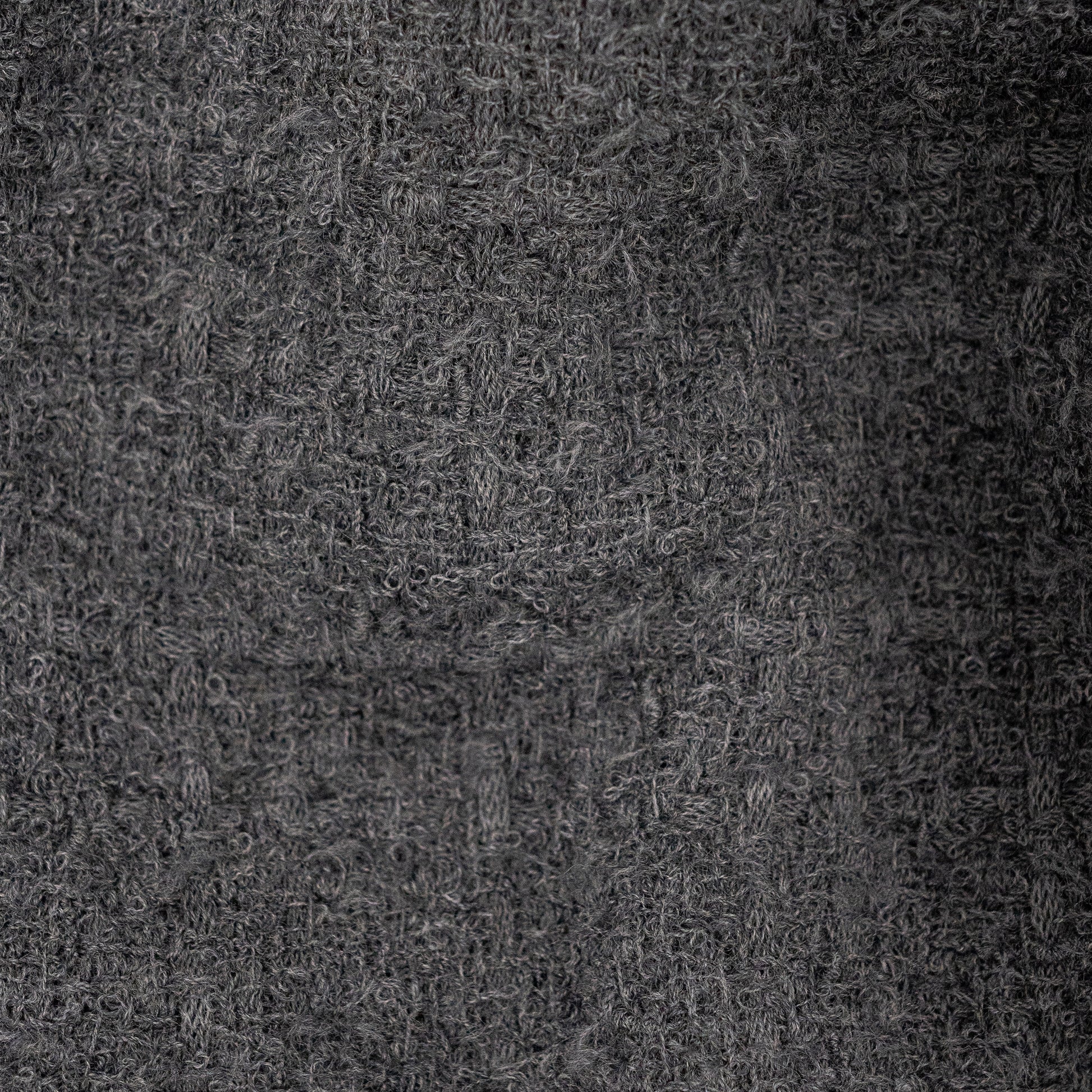 梳毛とは、毛羽立ちが少なく、4シーズン着れるためnonnotteでは毎シーズン使用しているのですが、 僕自身梳毛のツイードは見たことが無かったのでとてもワクワクしました。 色もオリジナルの霜降りグレーを紡績して頂き、そこから5種類のファンシーヤーンを作成頂きました。 フリンジの糸や、ノットヤーン、丸胴のチューブ状の糸など、自分の理想とする5種類全てを今回のツイードに織り込み、 あえて5種類の糸全てを1色にすることで、無地面の中に奥行きと表情を込めて作って頂きました。
