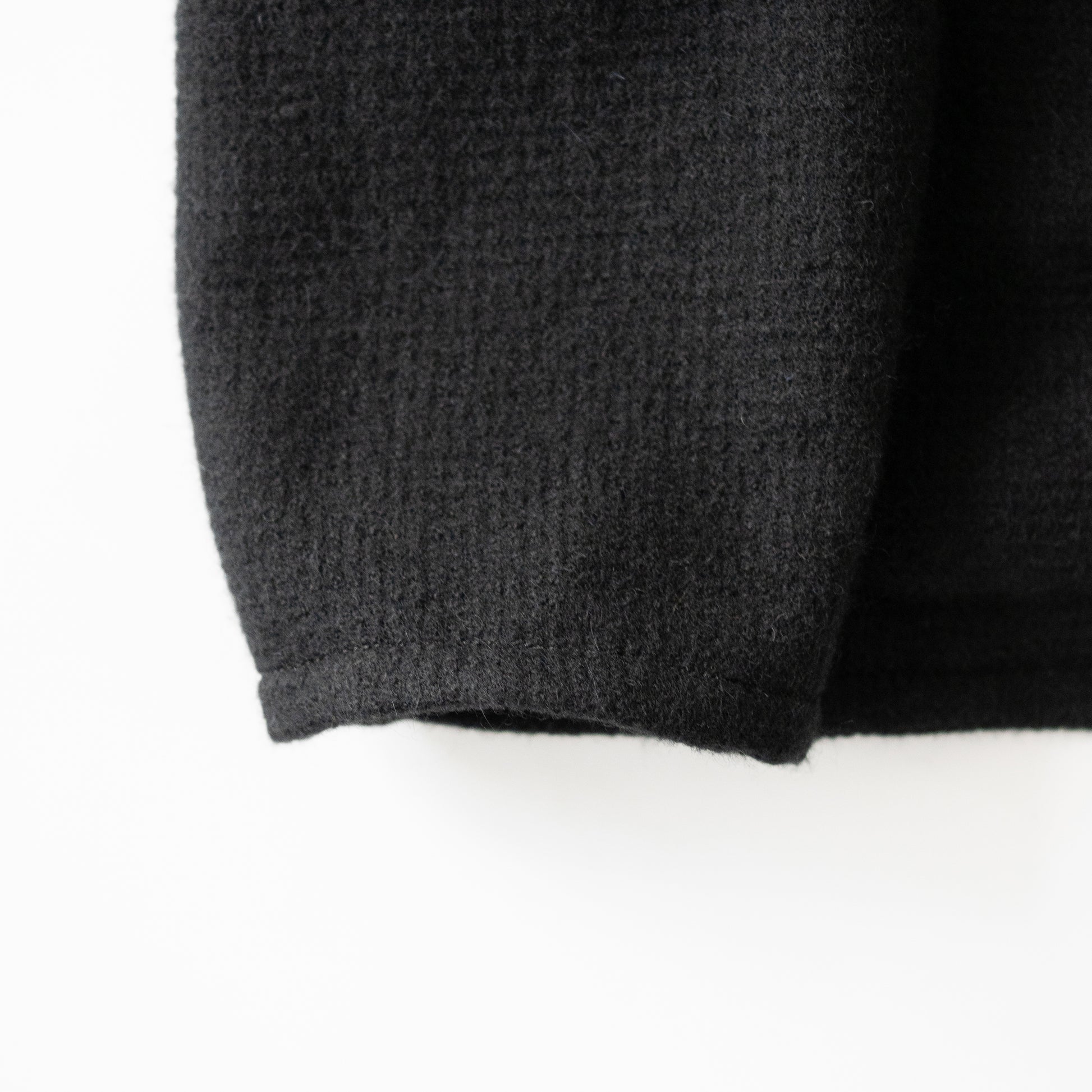 織物でワッフルのような複雑な組織を作るために採用した織組織はドビーです。 ドビーを使い、オリジナルのワッフルを表現しました。 伸びる心配がなくなったことから、贅沢な風合いを楽しみたかったので、ベビーアルパカとウールを混ぜて、フワフワのタッチを目指しました。 本当に不思議です。 見た目はまるでニットなのに、織物なので僕の好きなパターンワークもできるし、シルエットも出せる。 ワッフルの悪いところを全て解決しています。 これは未来のセーターだと自負しております。 なので気合の3色展開となっております。といいますか、絞れませんでした、、 無染色のホワイト、今回のテーマでもある正装のチャコールTOP、そして黒 どれも削れませんでした。