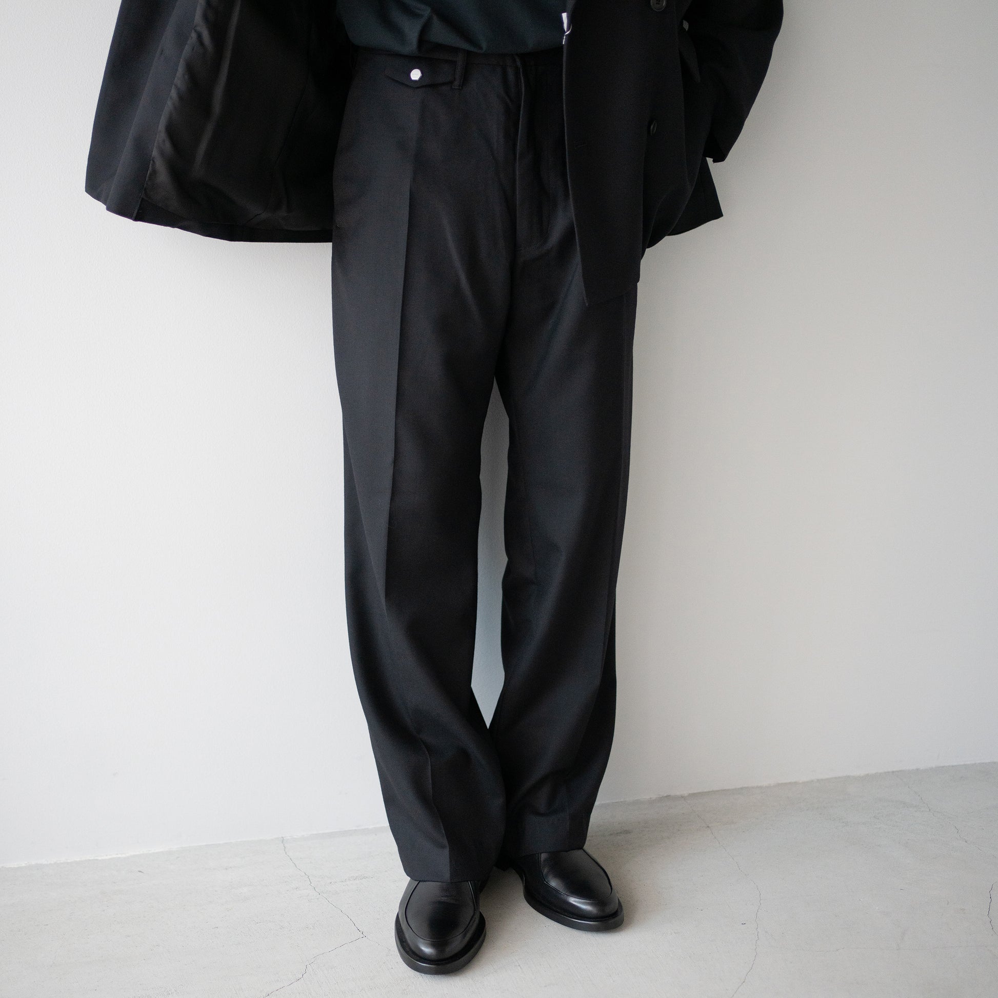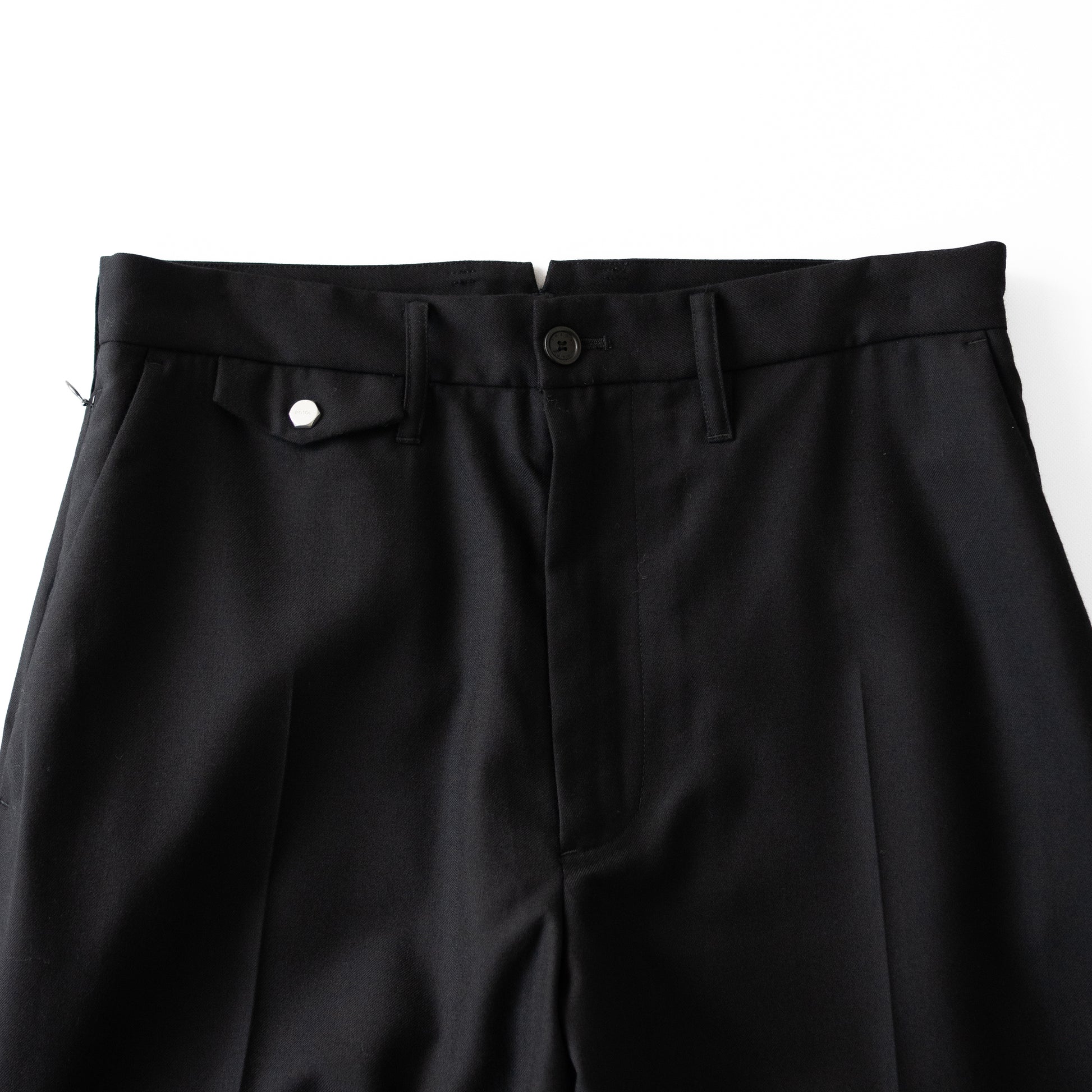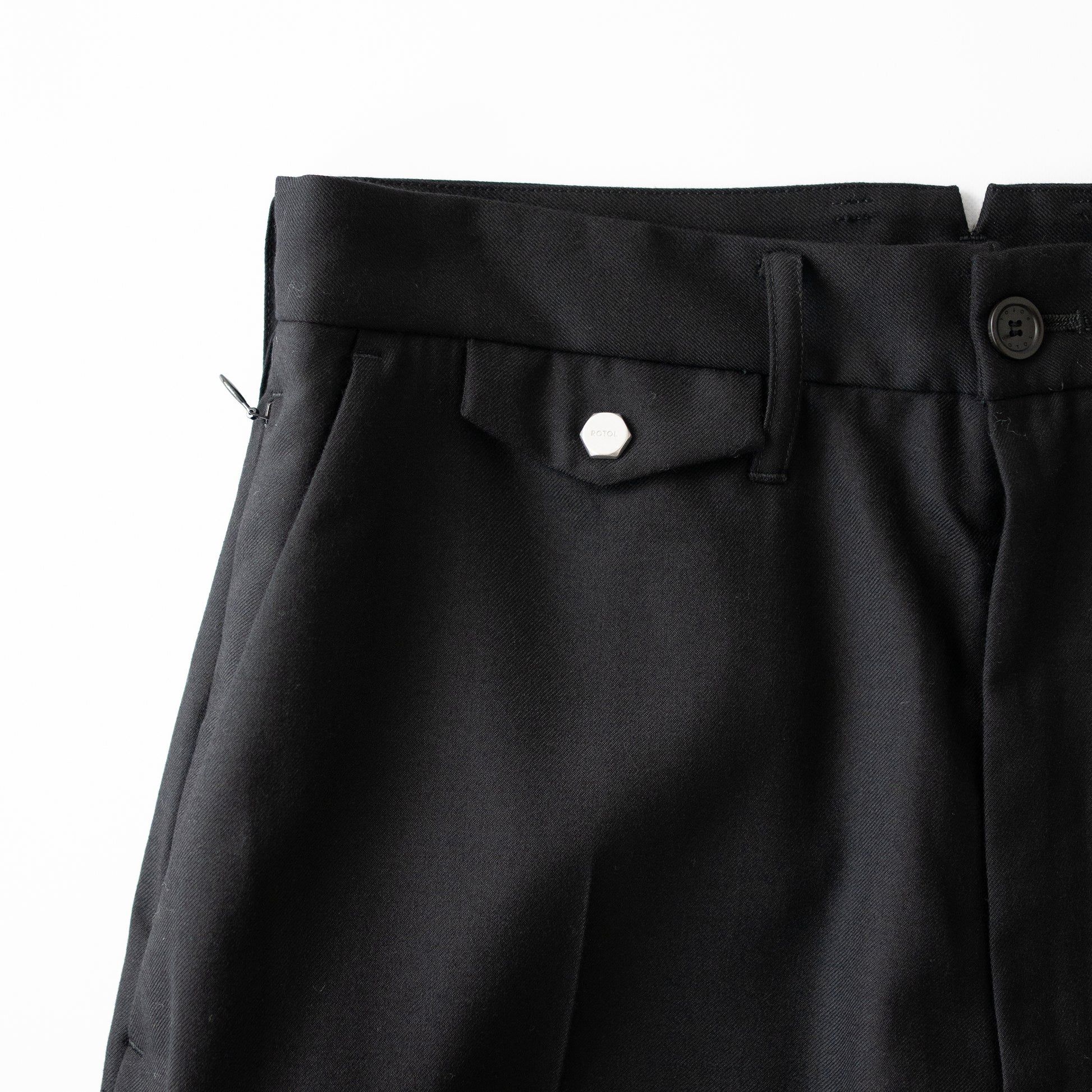 SUPER100Sのウールサージを使用したワイドスラックス。腰回りをすっきりと見せるノータック仕様。腰ポケットにはジップポケットとスラッシュポケットを組み込み、コインポケットのフラップにはアイコンのドットボタンを配置。