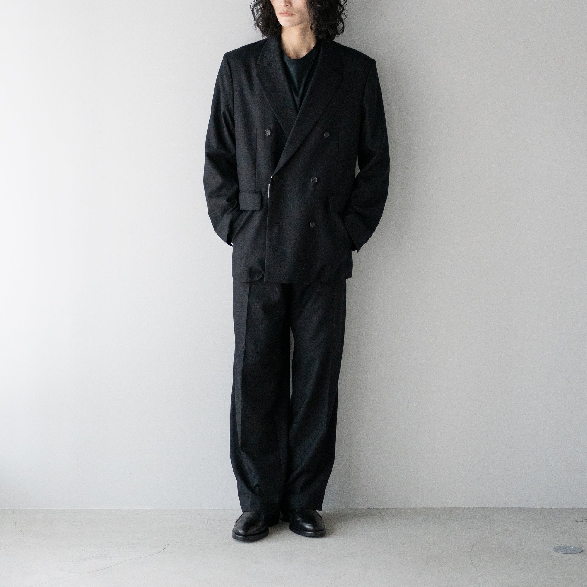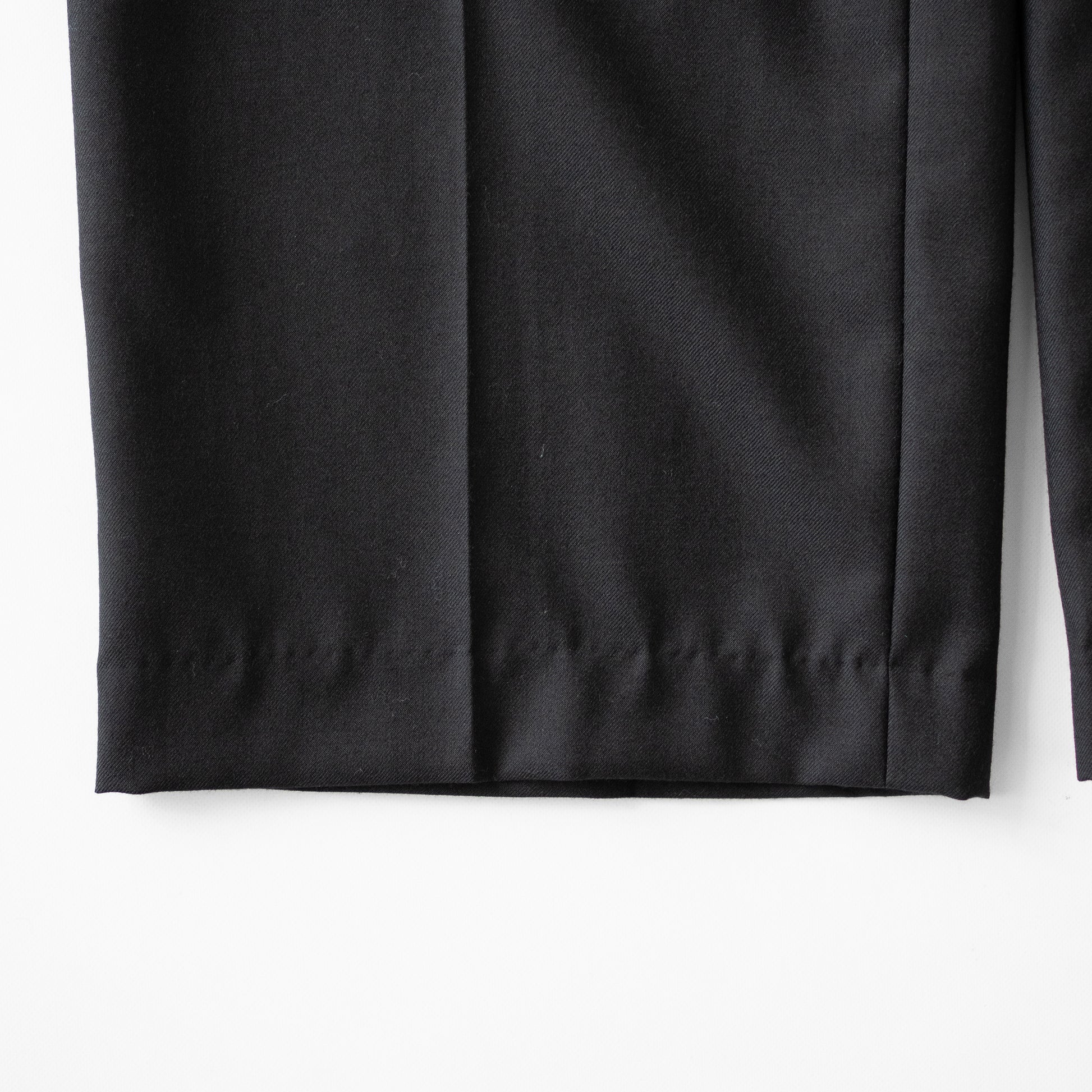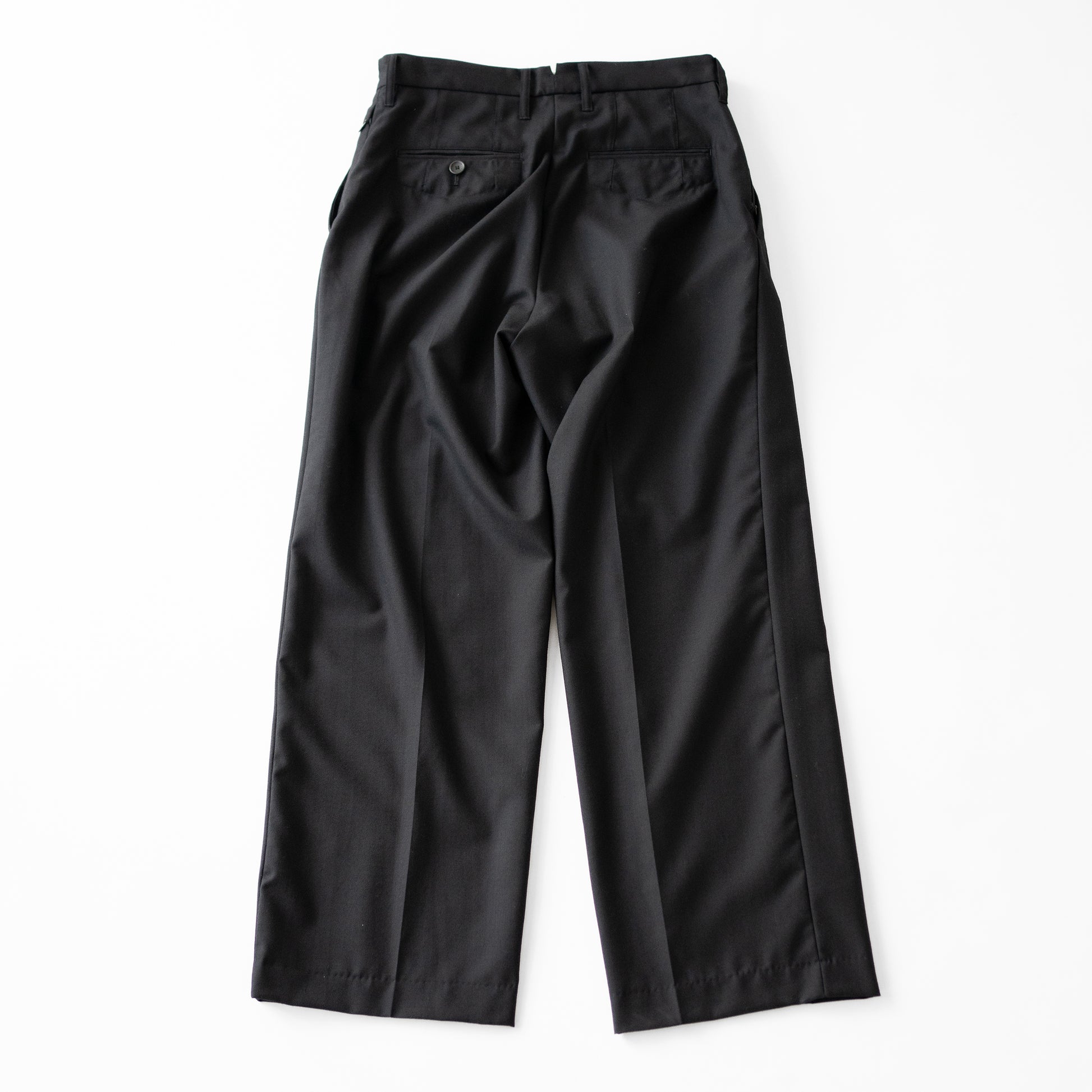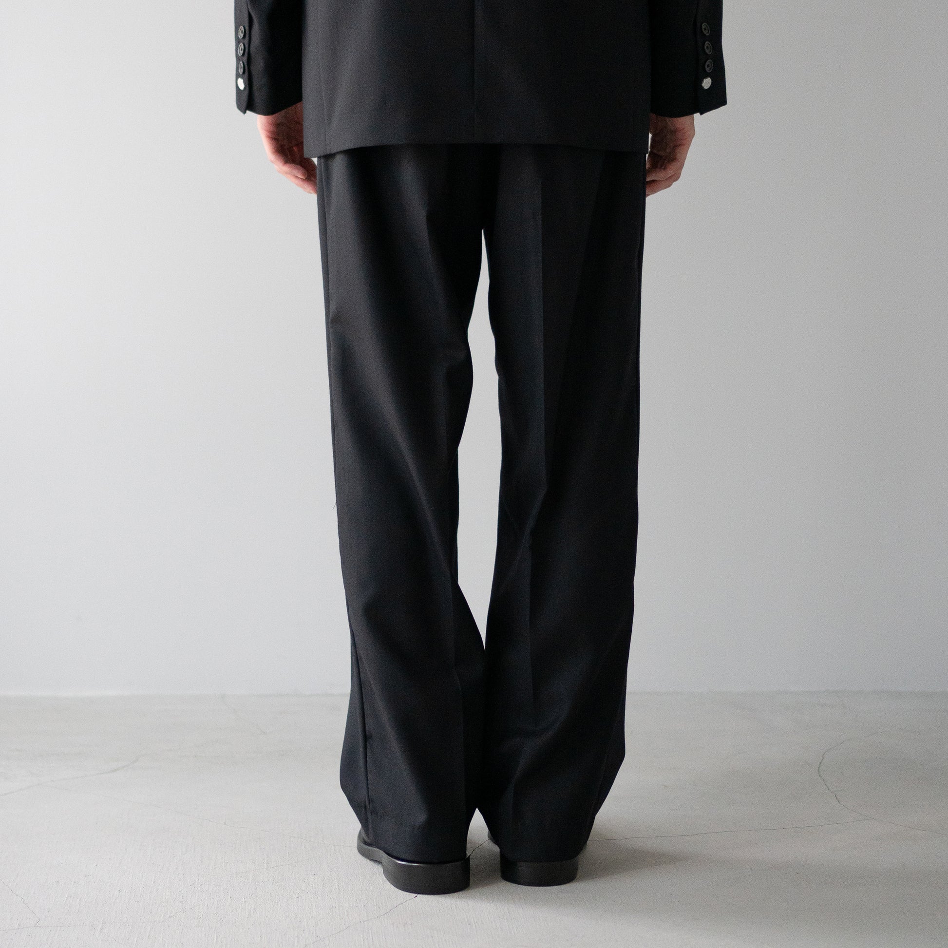 SUPER100Sのウールサージを使用したワイドスラックス。腰回りをすっきりと見せるノータック仕様。腰ポケットにはジップポケットとスラッシュポケットを組み込み、コインポケットのフラップにはアイコンのドットボタンを配置。