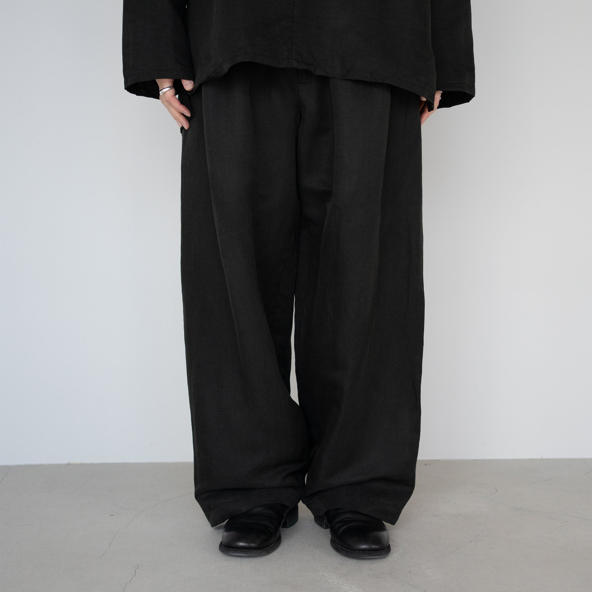 リネンシルクカルゼ生地を使用した3タックトラウザーズ。
